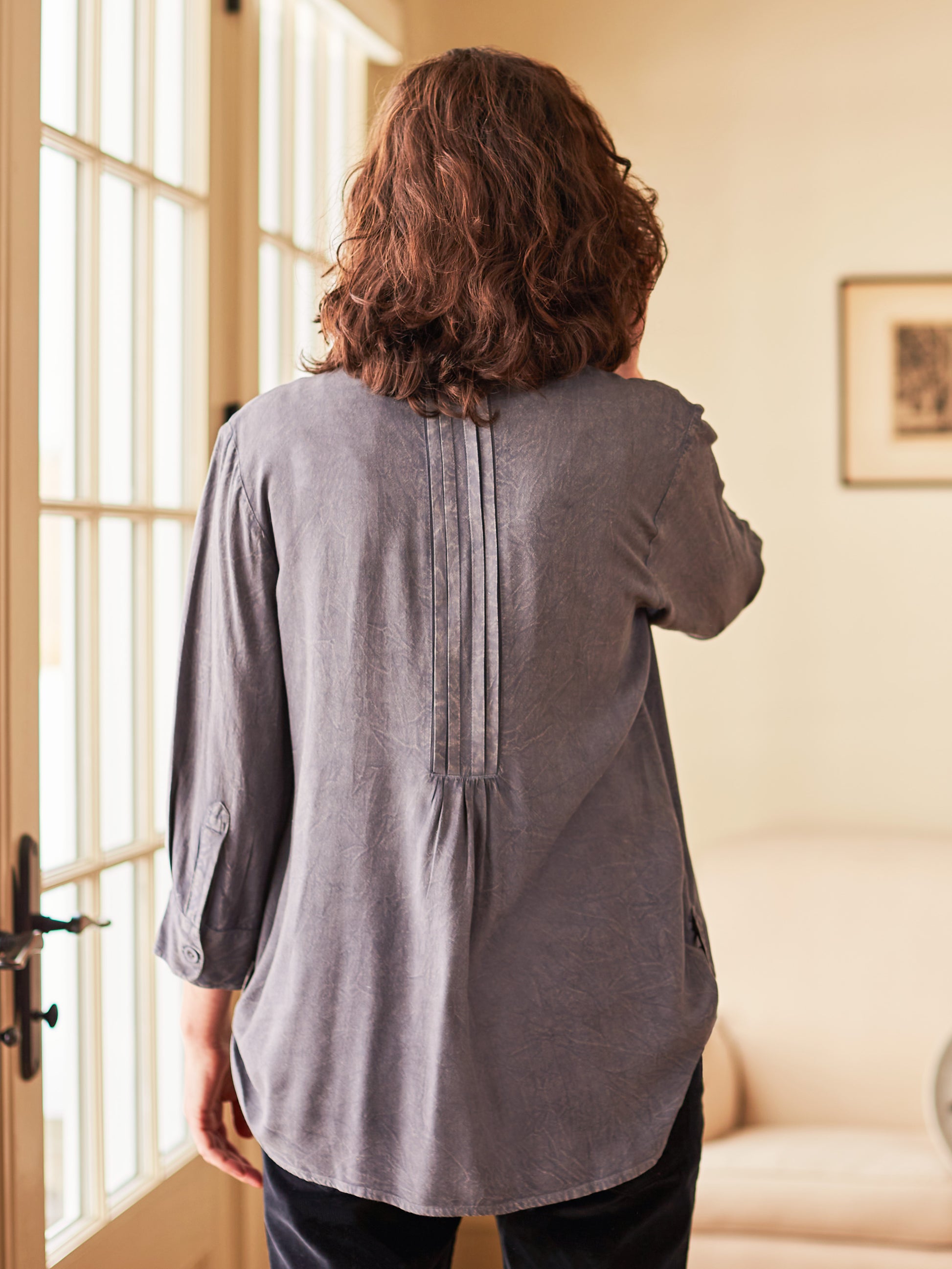 Sublime sunwashed rayon in a beautiful hue we call pewter is the perfect way to add some fab to your sway. Masterful detailing includes pretty pleats on the bodice, crochet trim insets and fabric covered buttons. Gorgeous.