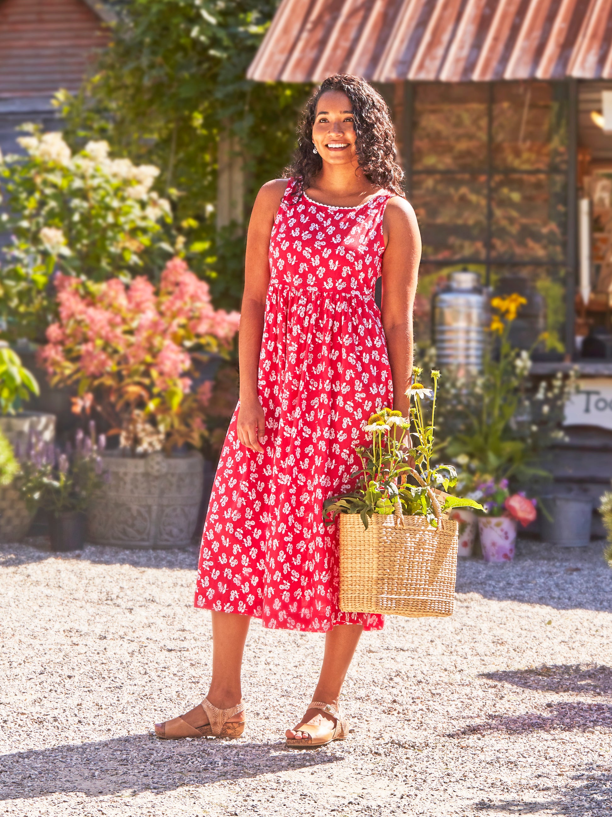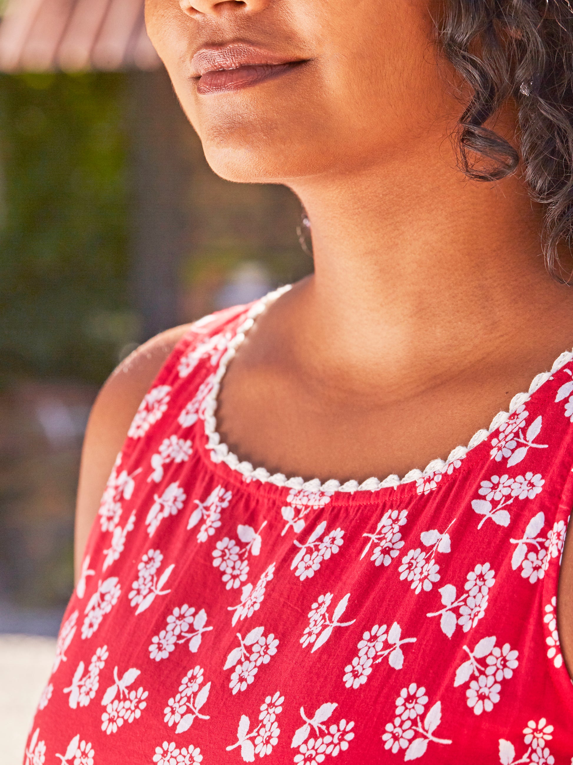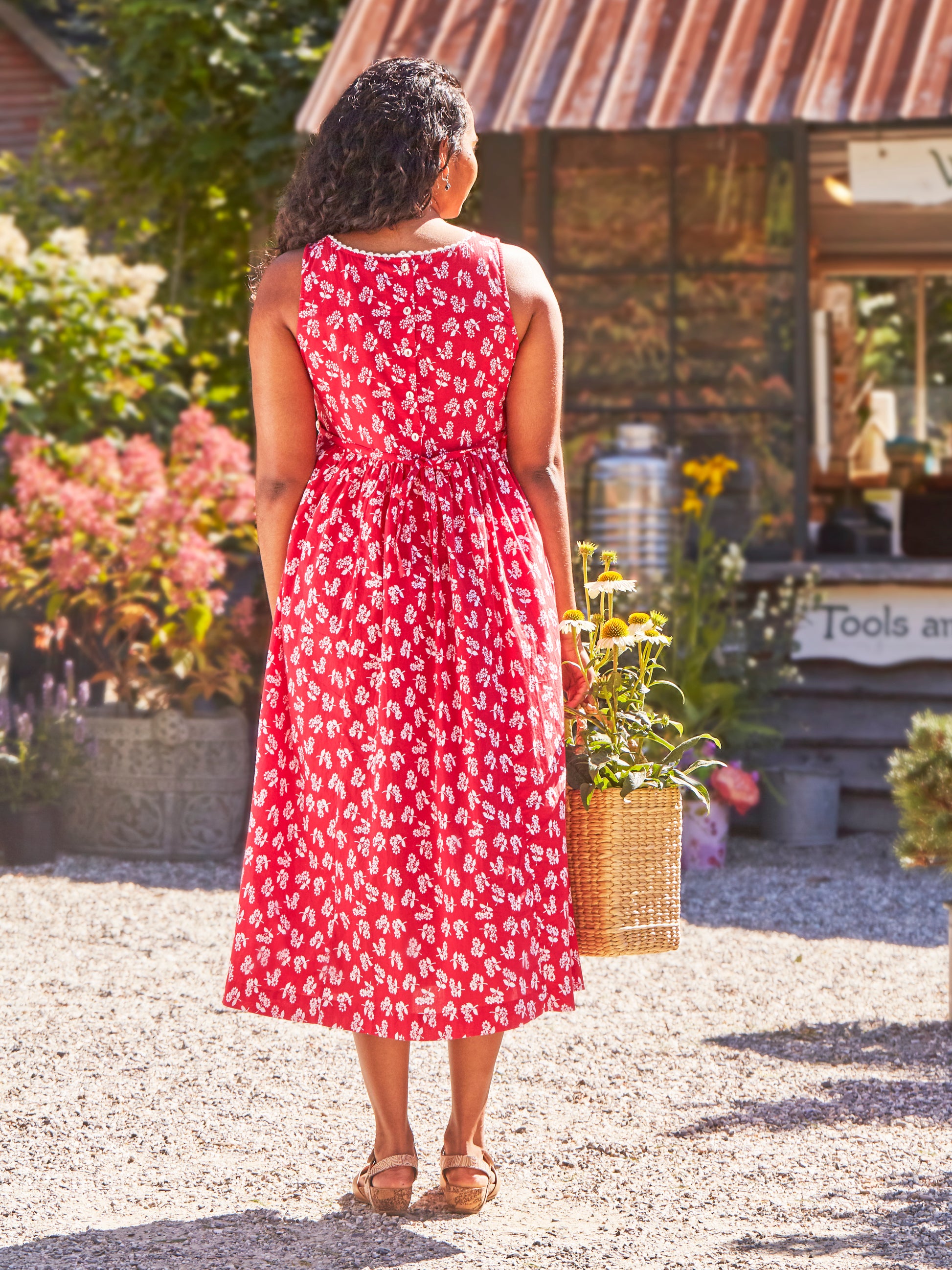 Bold and beautiful in ravishing redl! You know summer is just around the corner (think barbecues and days at the beach!)— and this is just the dress you'll be wanting to wear! Classic pinafore design highlighted by hand crochet trim, light gathers and button on ties to ensure a flattering silhouette.