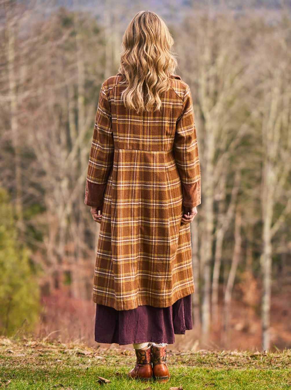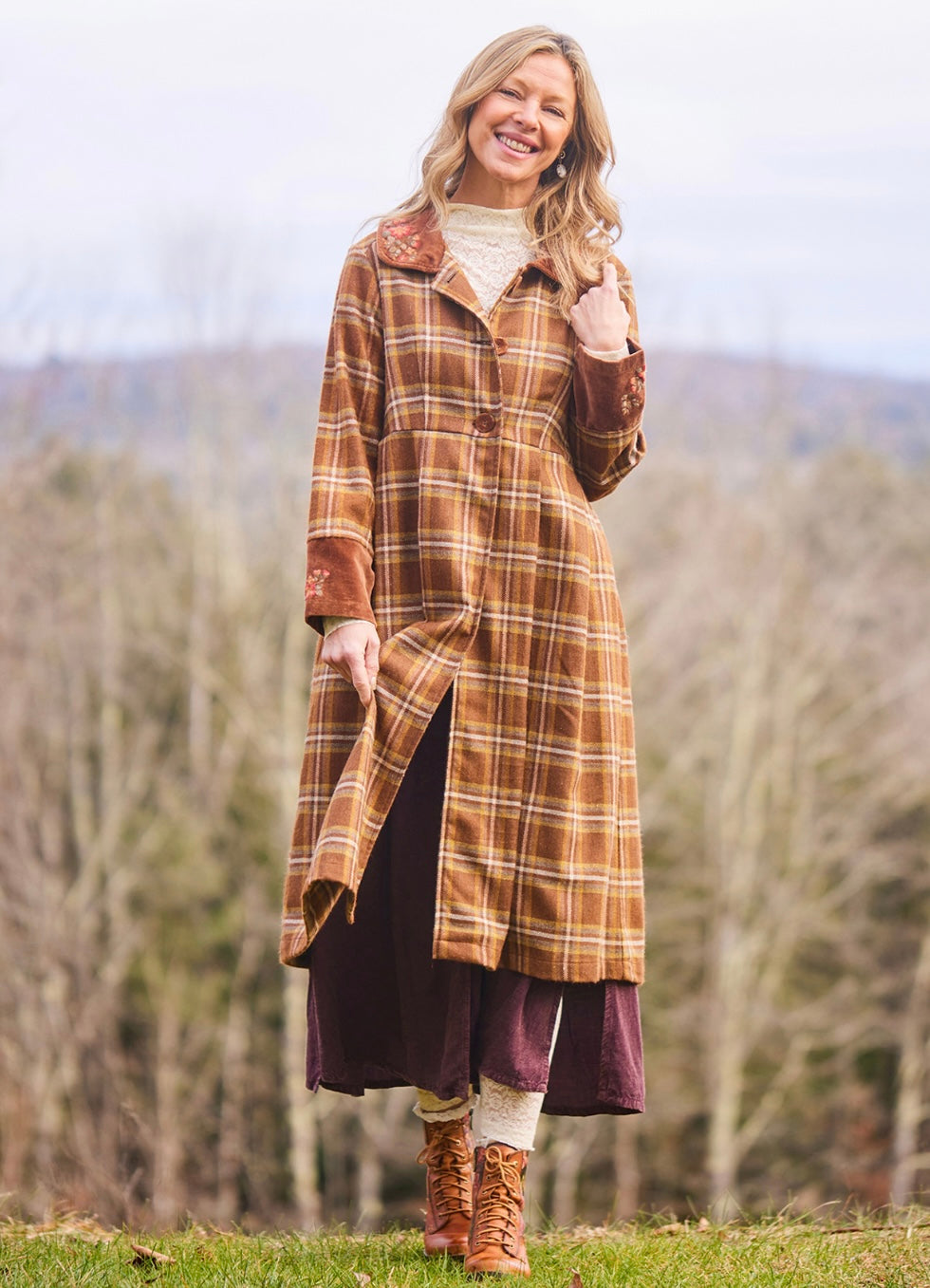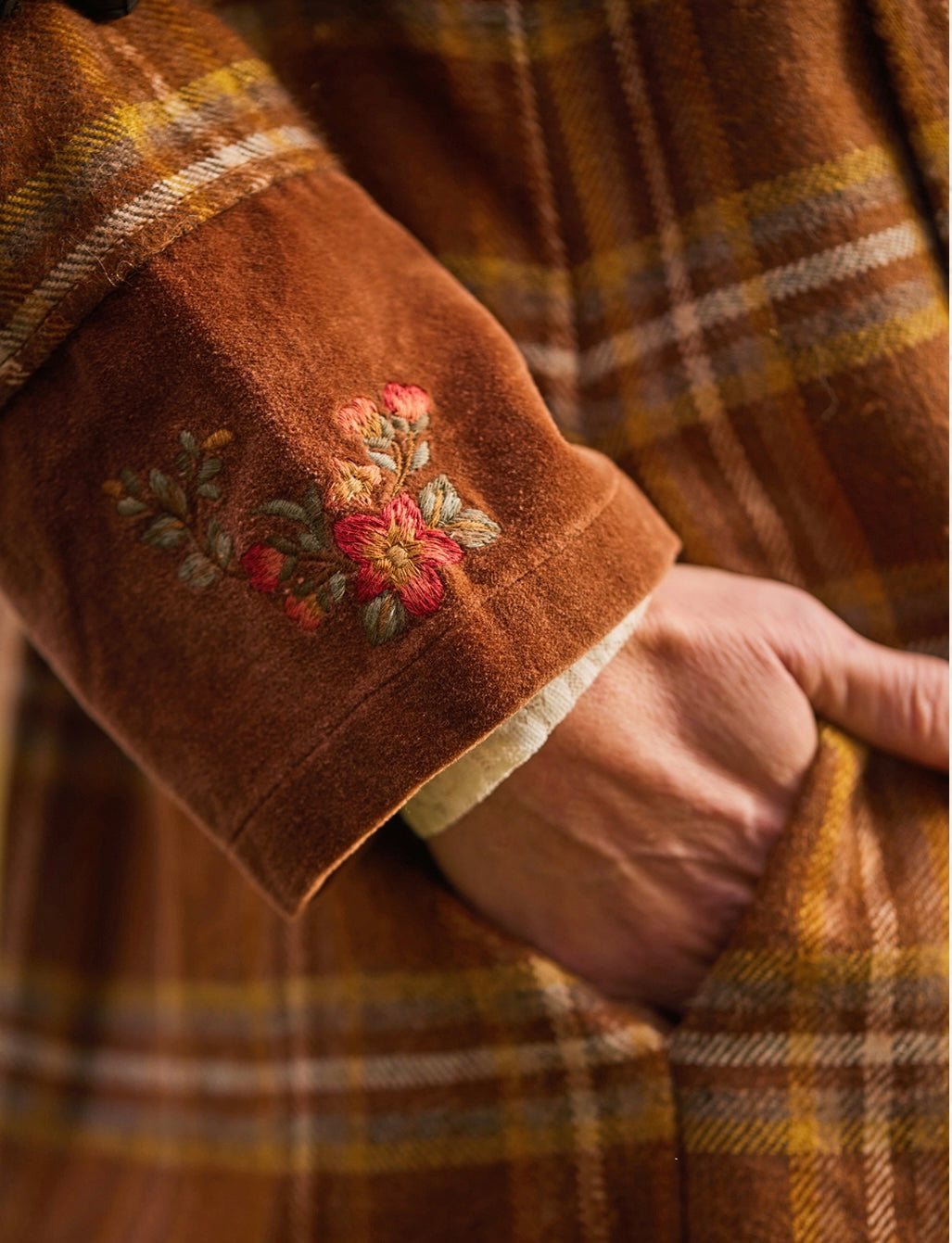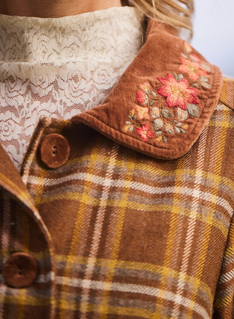 Yeah, who doesn't want an amazing golden check jacket named the Dickens? Fab details include a floral embroidered velvet collar and fabric covered buttons.