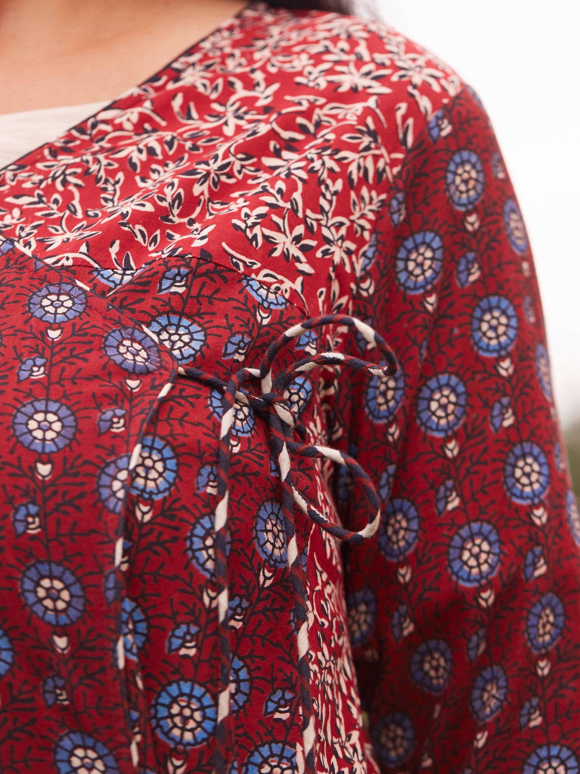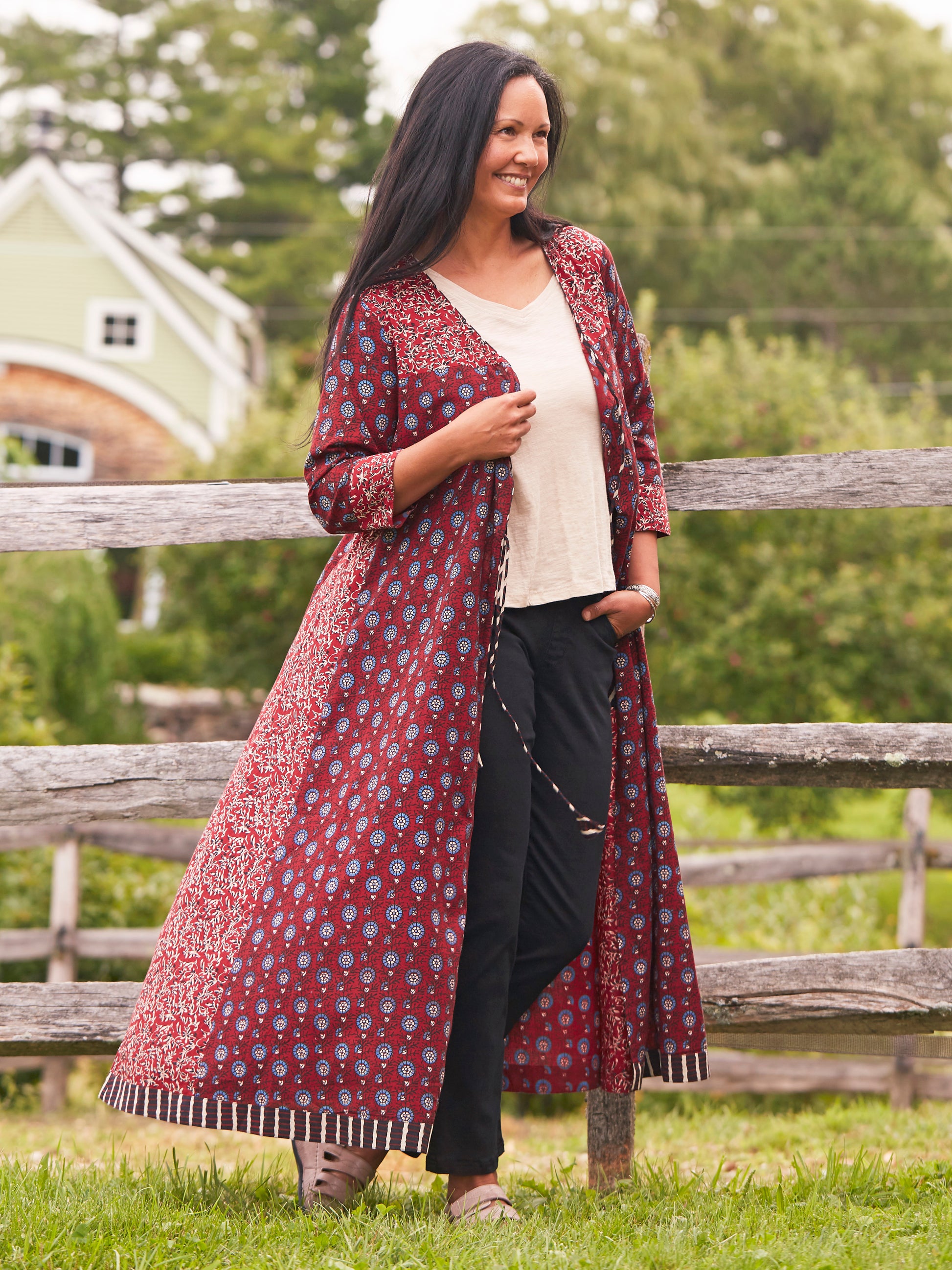 Hand printed cotton saturated in rich pomegranate makes for a vibrant vision that travels effortlessly from season to season. Ties for versatile styling, side seam pockets for life's necessities.