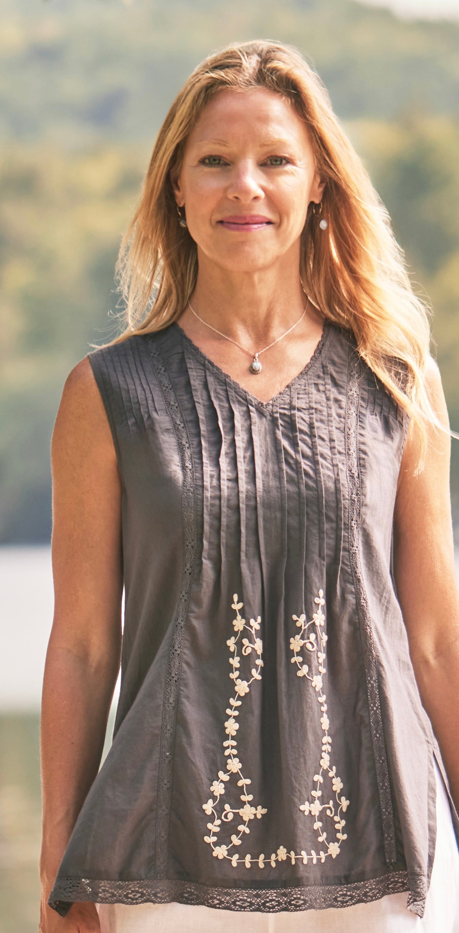 Exceptional cotton forms the basis for this darling cami treated to hand-guided ivory embroidery, pretty pintuck pleats, and signature crochet trims.