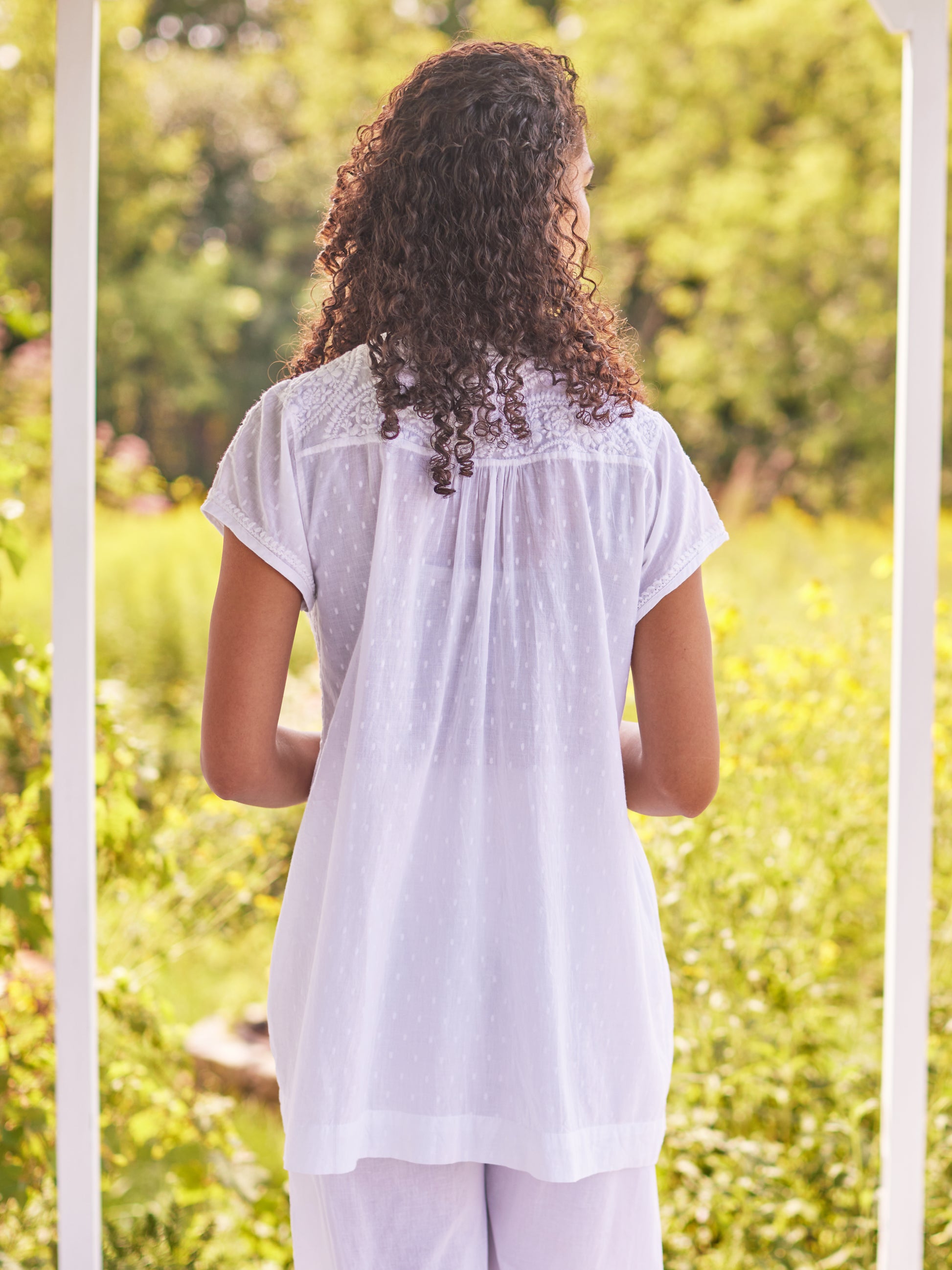 Gorgeous Swiss dot cotton rendered with incredible, hand-guided medallion and floral embroideries, light gathers, and a mother of pearl button closure.