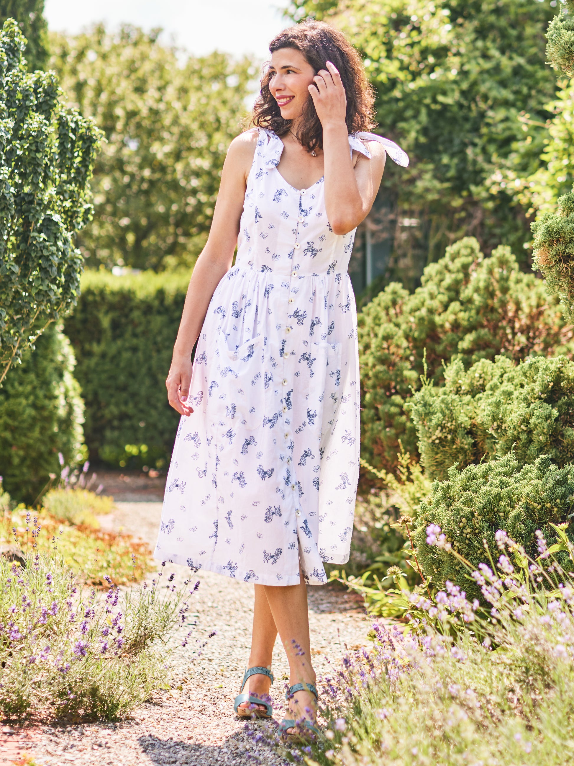 April's très chic indigo poodles and butterflies pose for delightful effect in this deliciously fun design on cotton. Flattering princess seams, oversized patch pockets and button on ties for a custom silhouette.