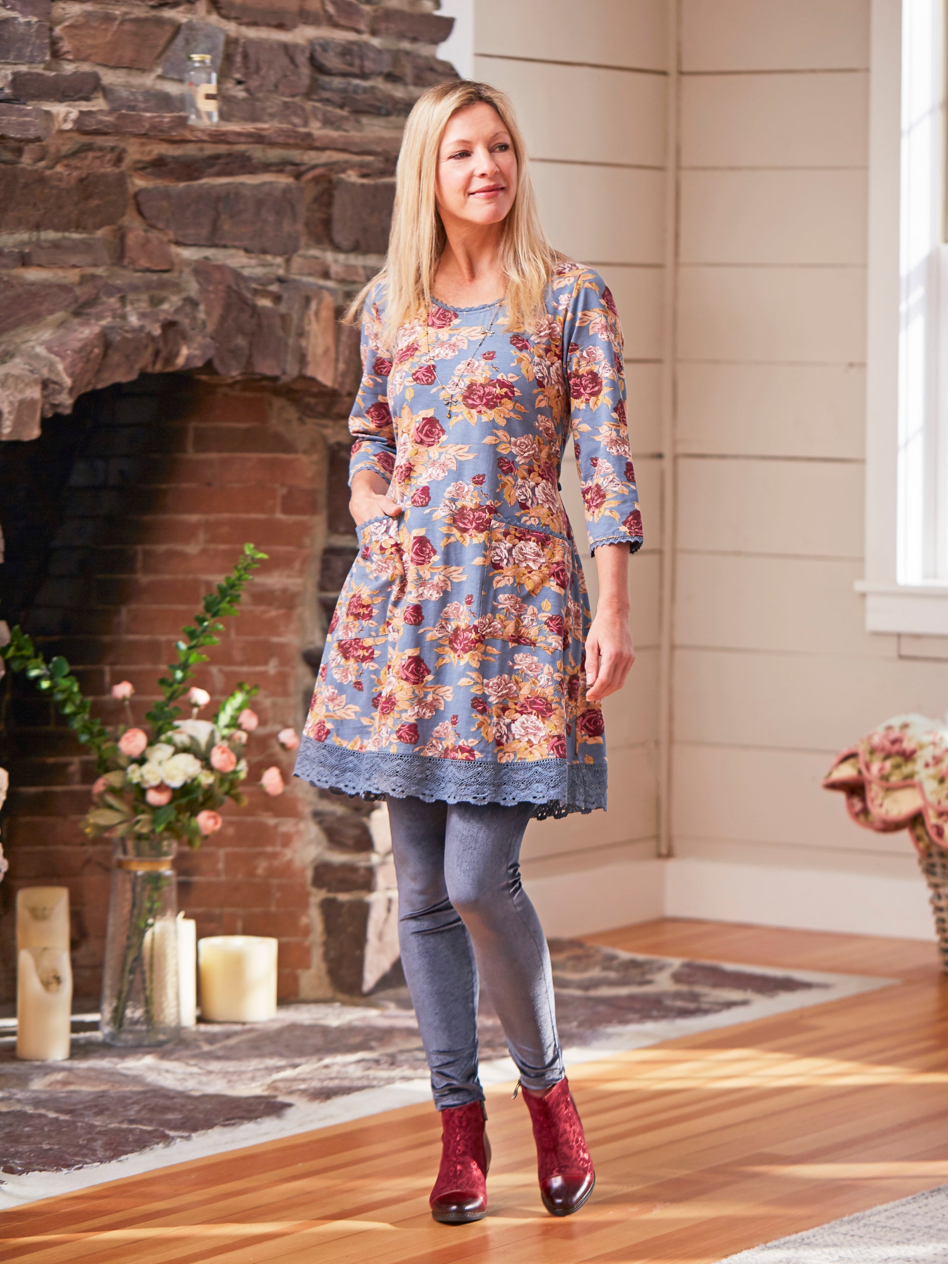 Dusty blue jersey with a great hand and topped with a gorgeous April floral? You're speaking my love language baby! Flattering form designed with elegant lace trims, patch pockets and button on ties.