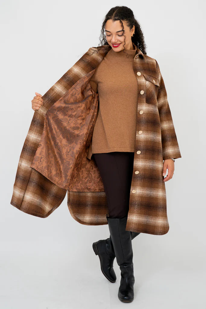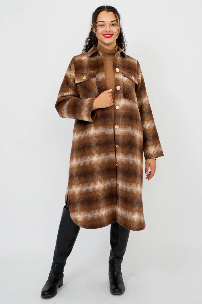 Designed with a classic plaid design, making this coat perfect for every day! The button-up front adds to its functionality, while the tailored collar polishes off its relaxed aesthetic. Hemmed just past your knees for those cooler days!