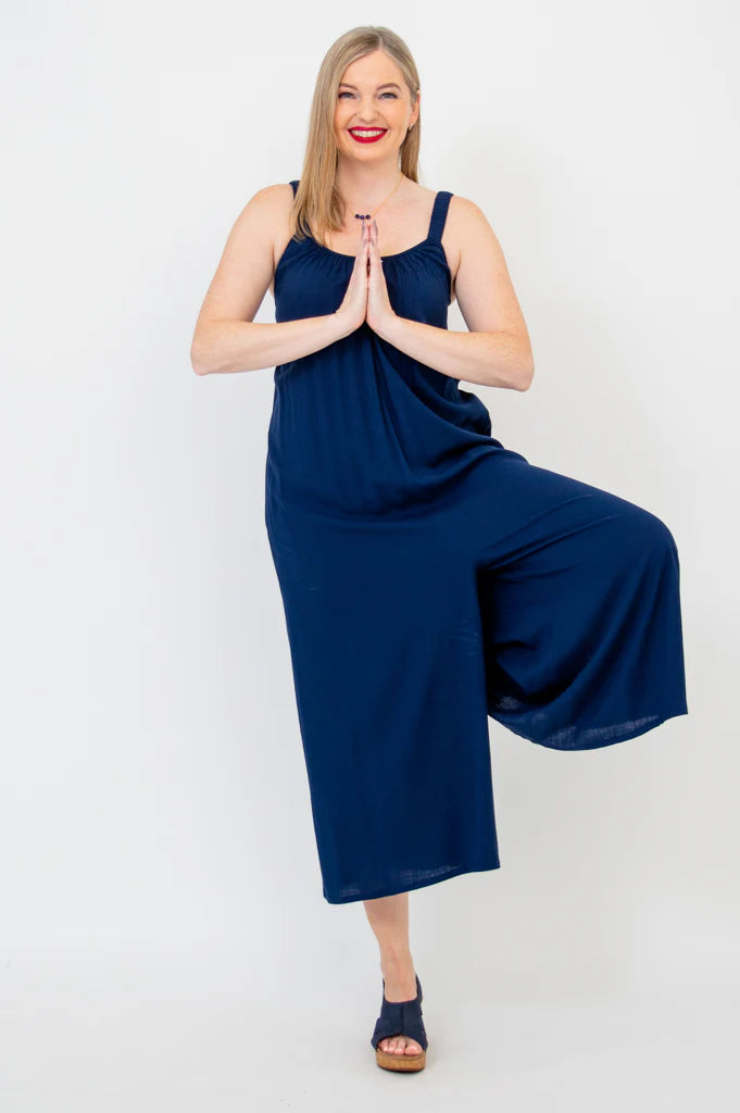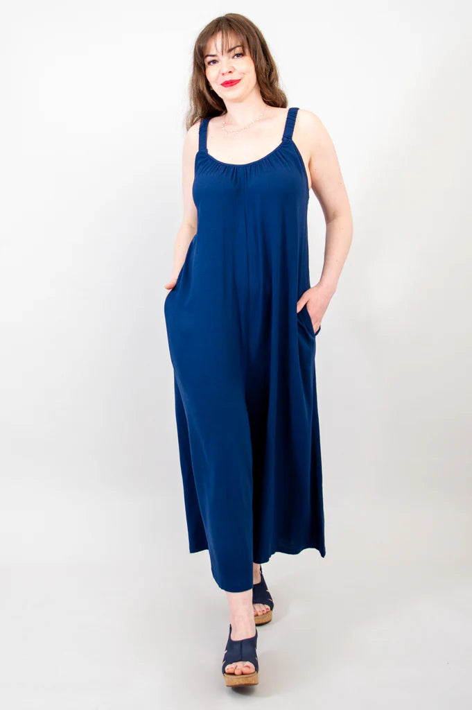Cropped jumpsuit in linen/bamboo. Wide, substantial straps for comfort; pockets; indelible style. Wide neckline allows easy slip-on-slip-off.