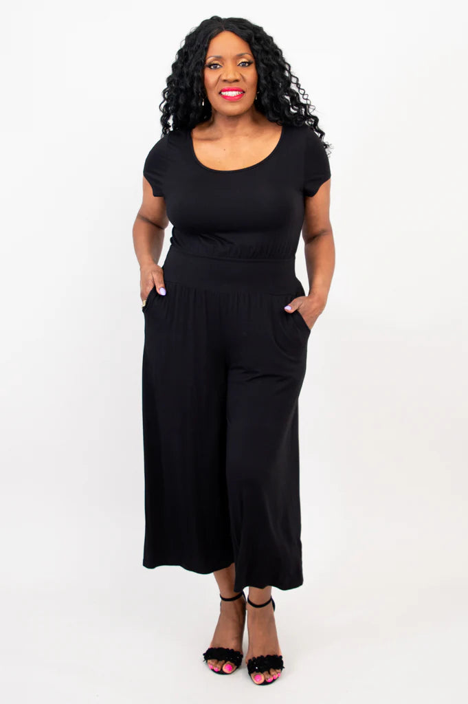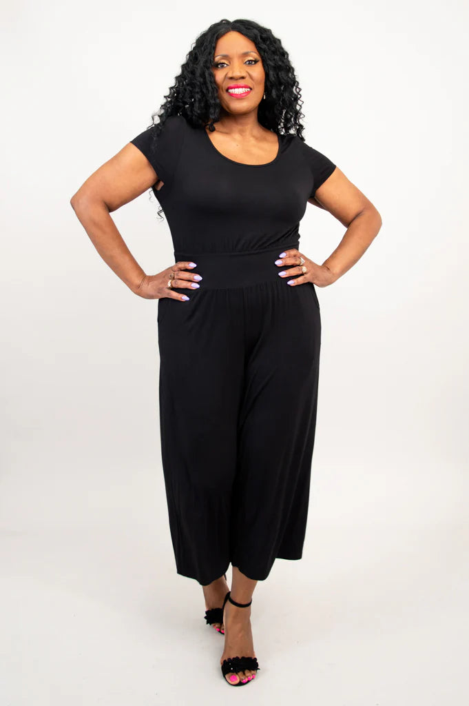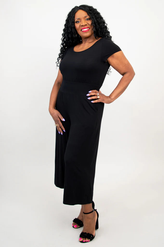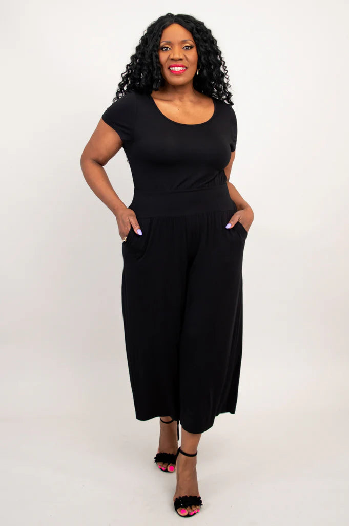All over Bamboo fabric means all over stretch and breathability. Short sleeves and wide, capri length legs make this piece very versatile; wear it with sneakers for running errands, heels for a night out, or even just your slippers when lounging at home. Inset pockets at the hip are perfectly placed and roomy enough for a phone or keys. Fitted through the bodice with a wide, scoop neckline, the Julie is sophisticated, modern, and of course comfy.
