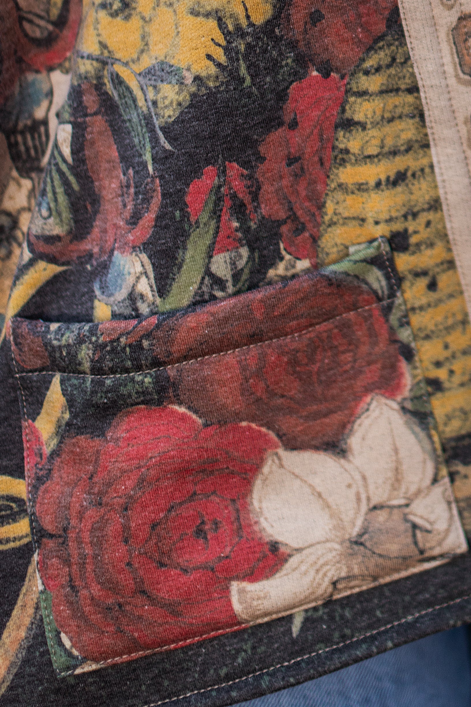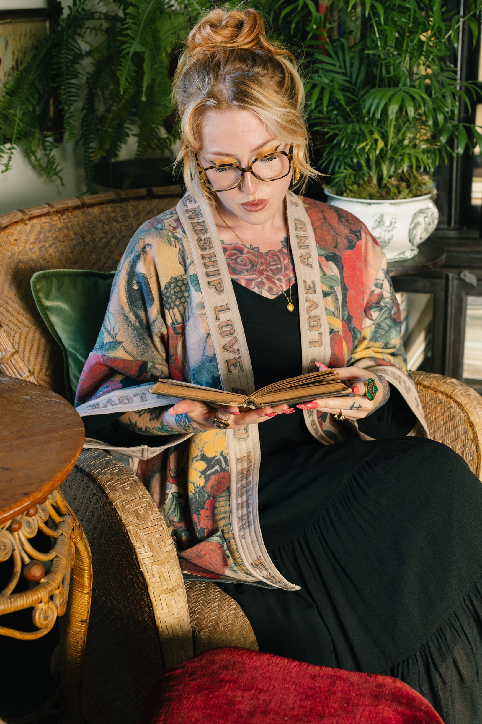 It takes a bold heart to live your truth. To keep reminding yourself that love is the answer, even on your hard days! We created this eclectic, super cool cardigan from an 1880s print unearthed in a library archive, and adapted the utterly charming wood-grain lettering to build the trim. The result is one of our favourite pieces in the collection: beautiful and completely unique, with a lot of romance, and a touch of rock and roll.