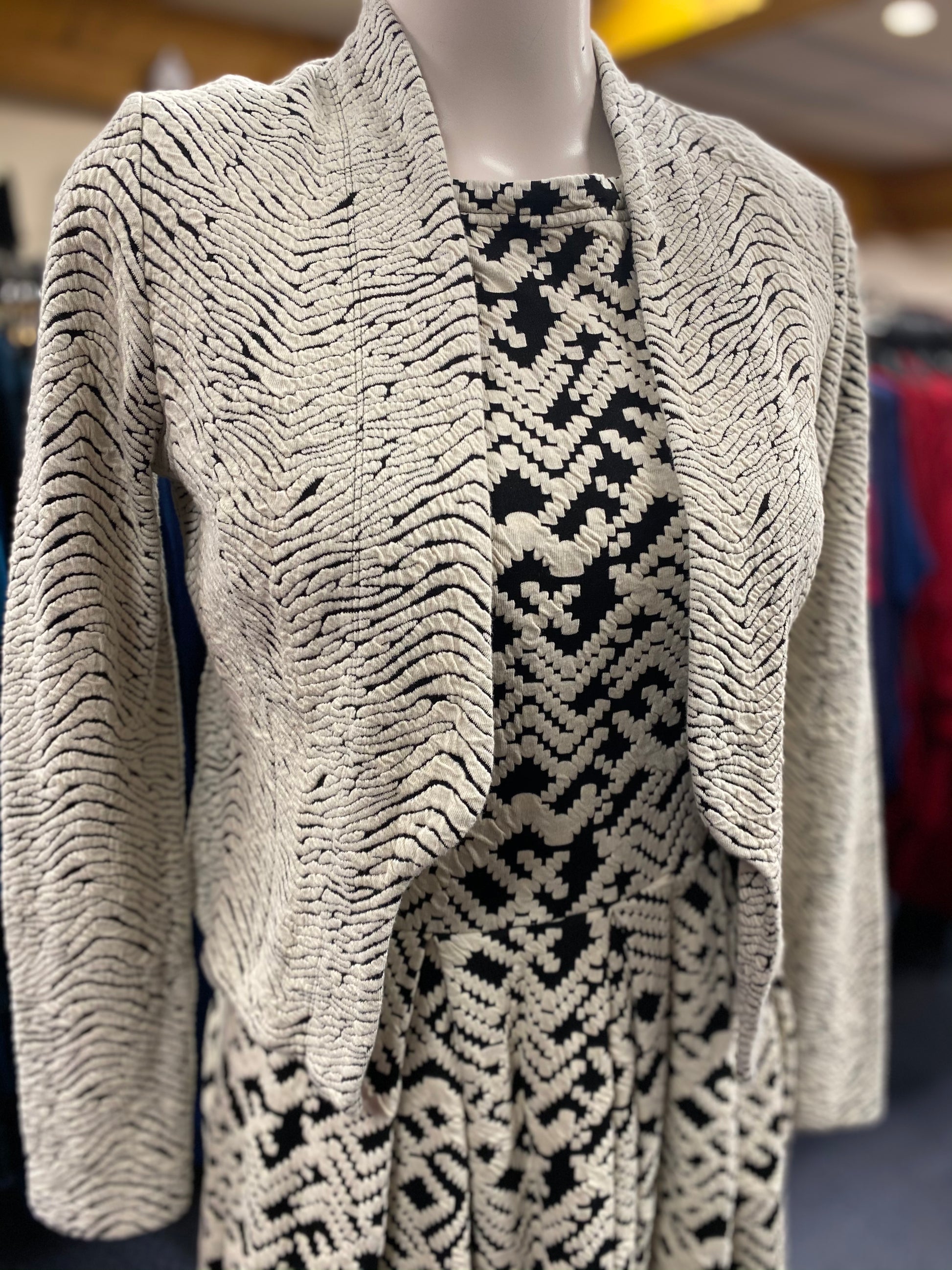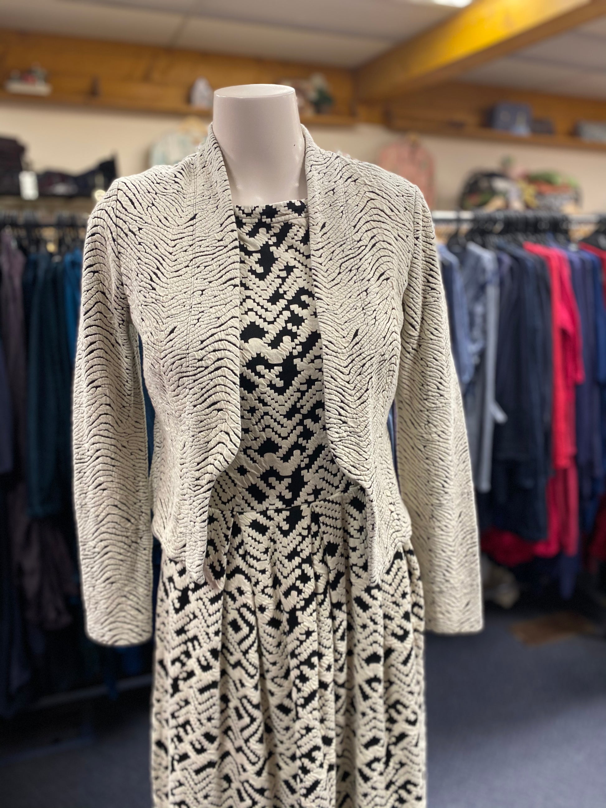 This Eveline Street Dress is made of 68% cotton 27% nylon and 5% spandex. It is stretchy and comfy and fits beautifully over the body with a flare just above the waist to just above the knee. This cotton is super soft and gets softer with wearing. Please note we sell the matching shrug separately and also a fit and flare skirt in the same fabric. Machine wash, lay flat to dry.