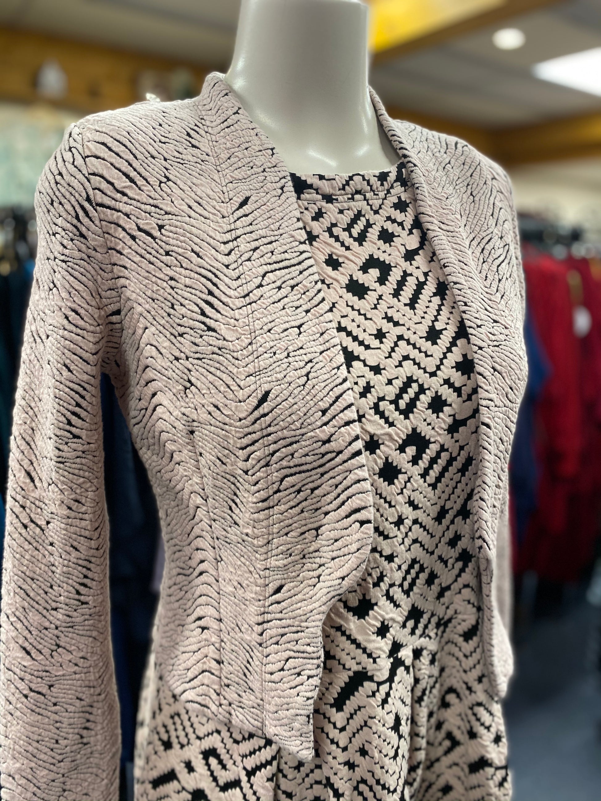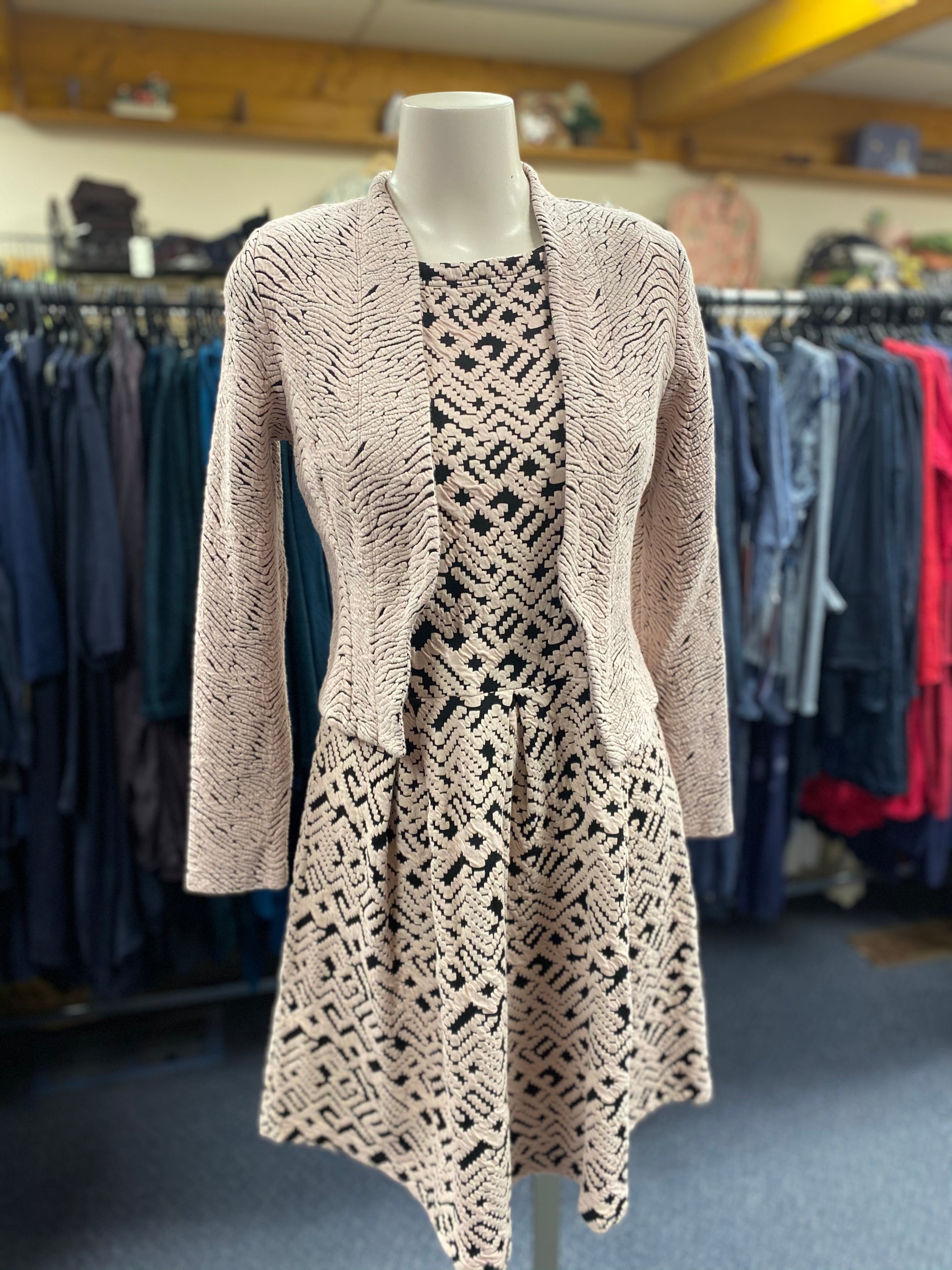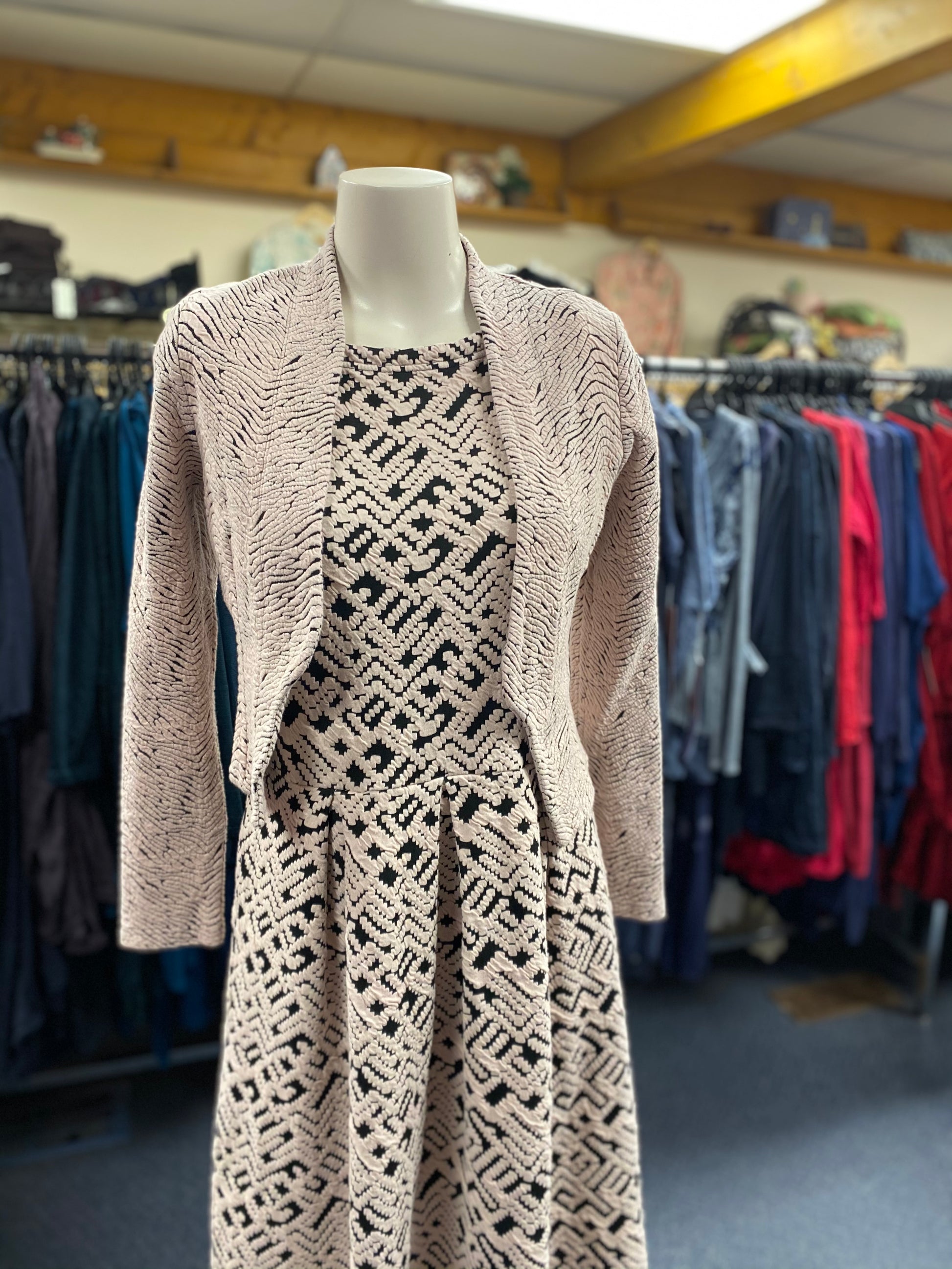 This Eveline Street Dress is made of 68% cotton 27% nylon and 5% spandex. It is stretchy and comfy and fits beautifully over the body with a flare just above the waist to just above the knee. This cotton is super soft and gets softer with wearing. Please note we sell the matching shrug separately and also a fit and flare skirt in the same fabric. Machine wash, lay flat to dry.