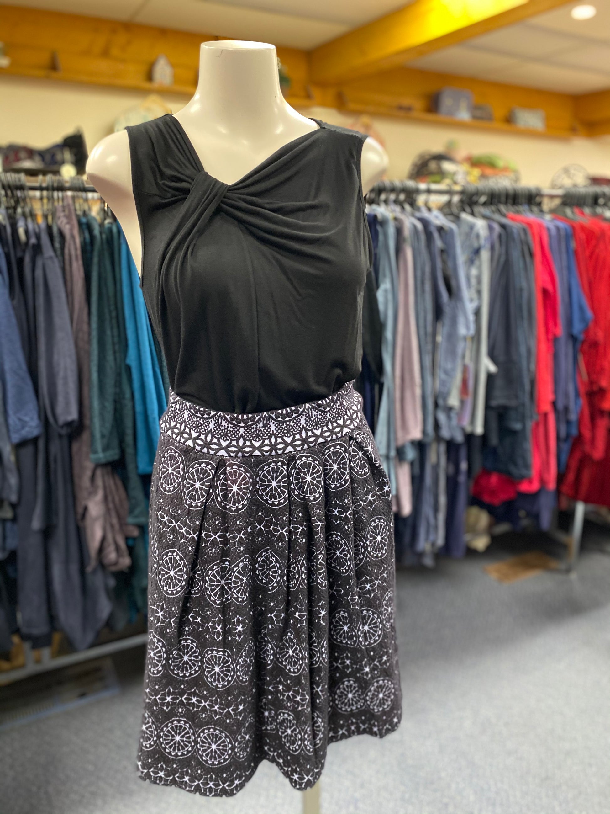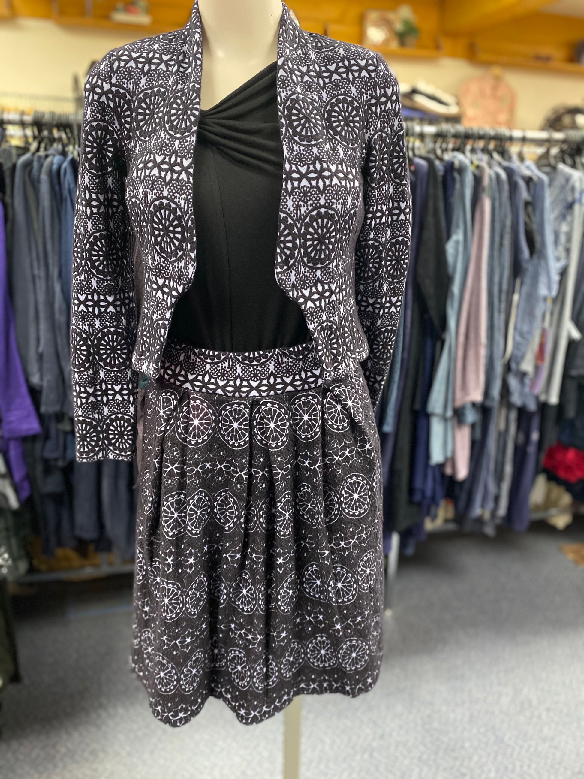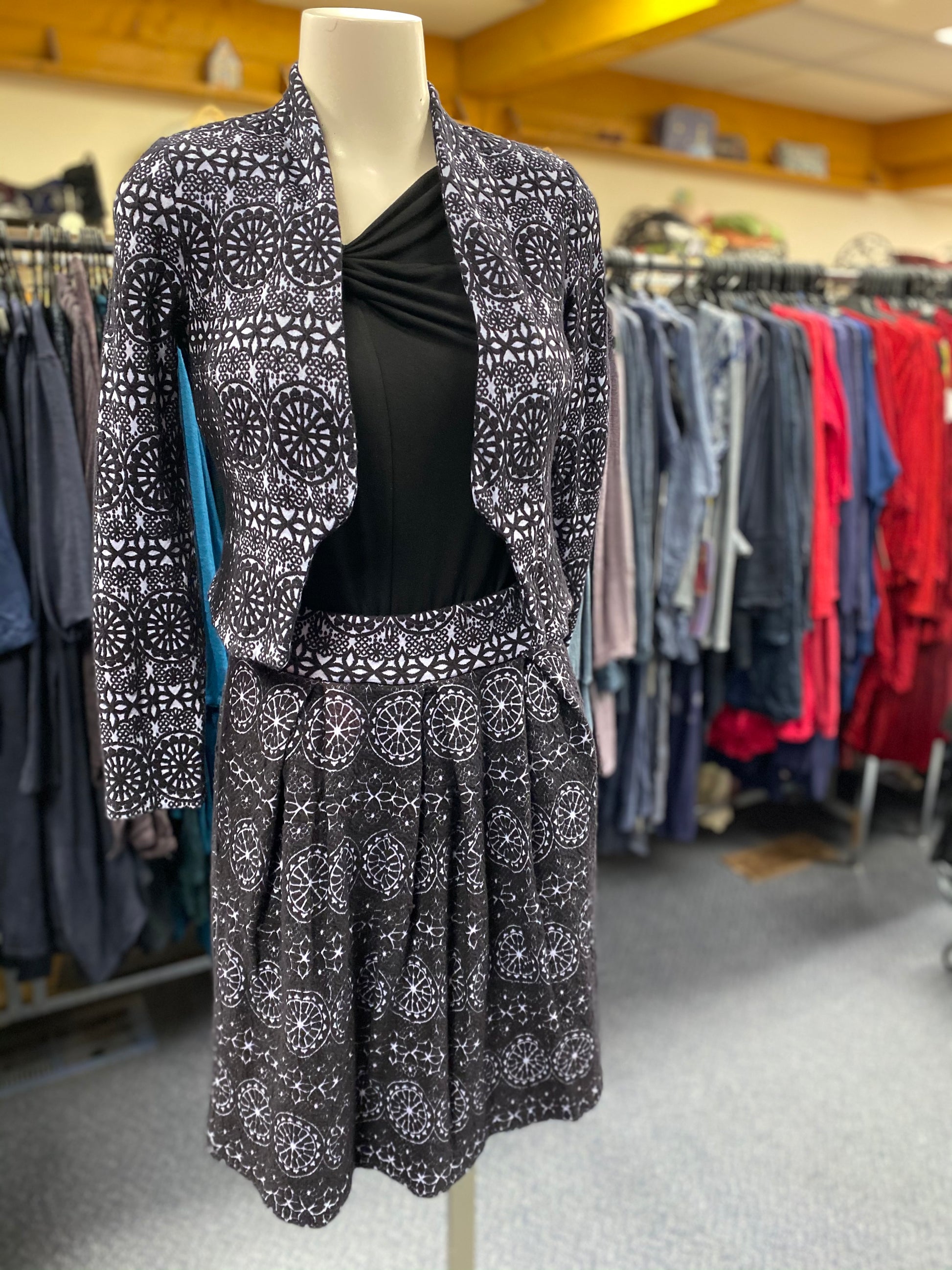 This Eveline Street skirt is made of 68% cotton 27% nylon and 5% spandex. It is stretchy and comfy and fits beautifully over the body with a flare starting at the waist to just about the knee. This cotton is super soft and gets softer with wearing. Please note we sell the matching shrug separately and also a fit and flare dress in the same fabric. Machine wash, lay flat to dry.
