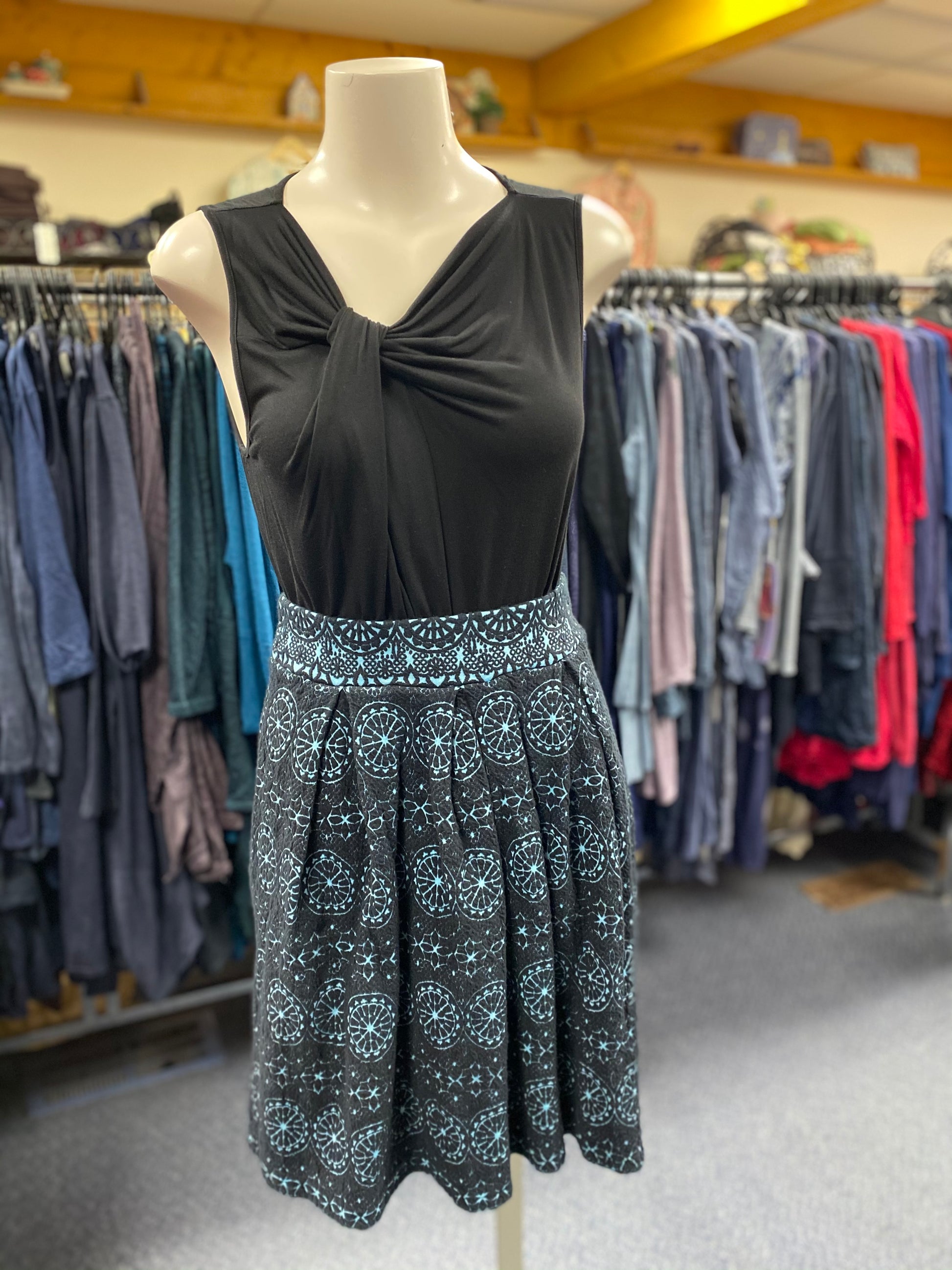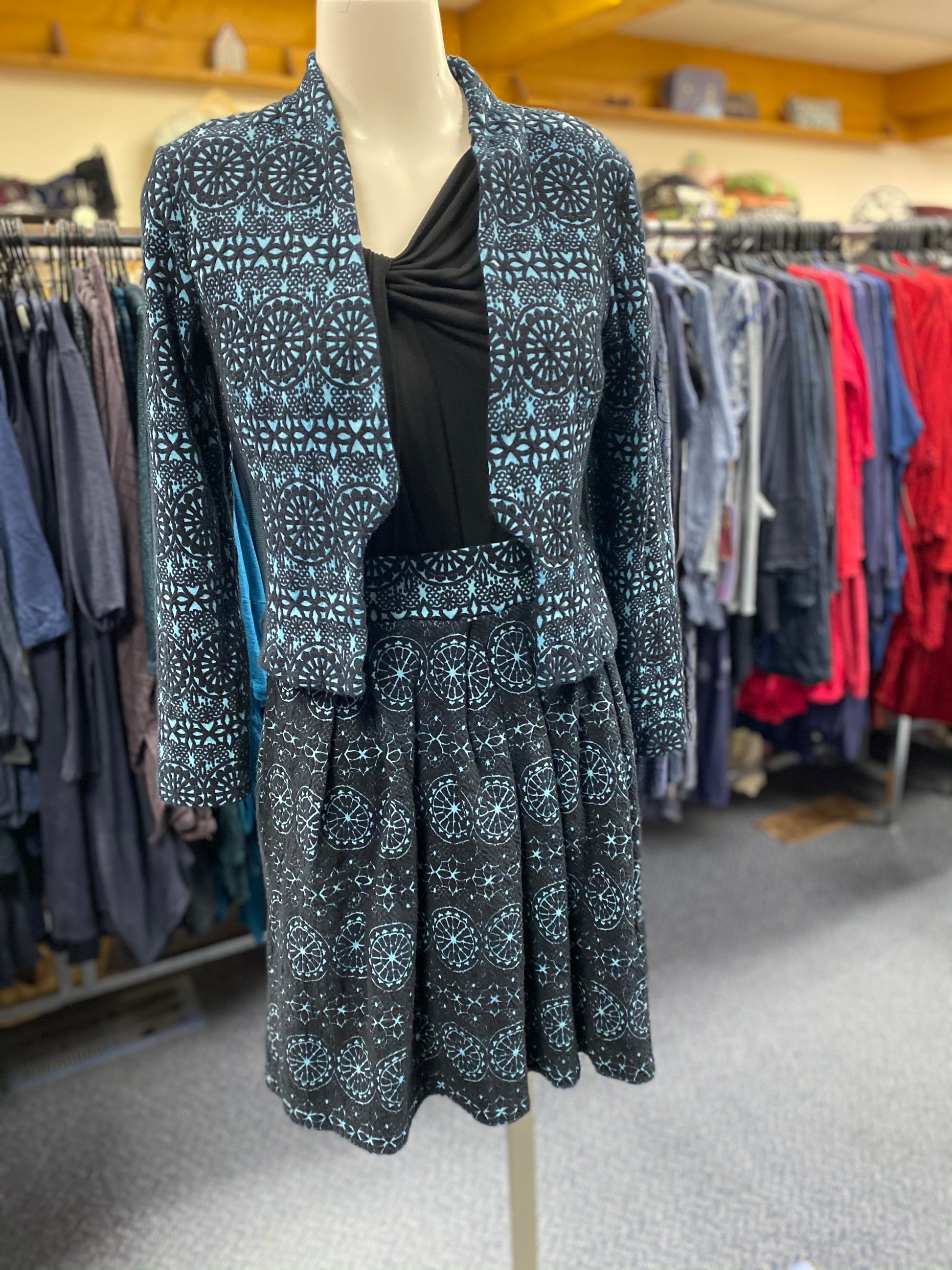 This Eveline Street skirt is made of 68% cotton 27% nylon and 5% spandex. It is stretchy and comfy and fits beautifully over the body with a flare starting at the waist to just about the knee. This cotton is super soft and gets softer with wearing. Please note we sell the matching shrug separately and also a fit and flare dress in the same fabric. Machine wash, lay flat to dry.