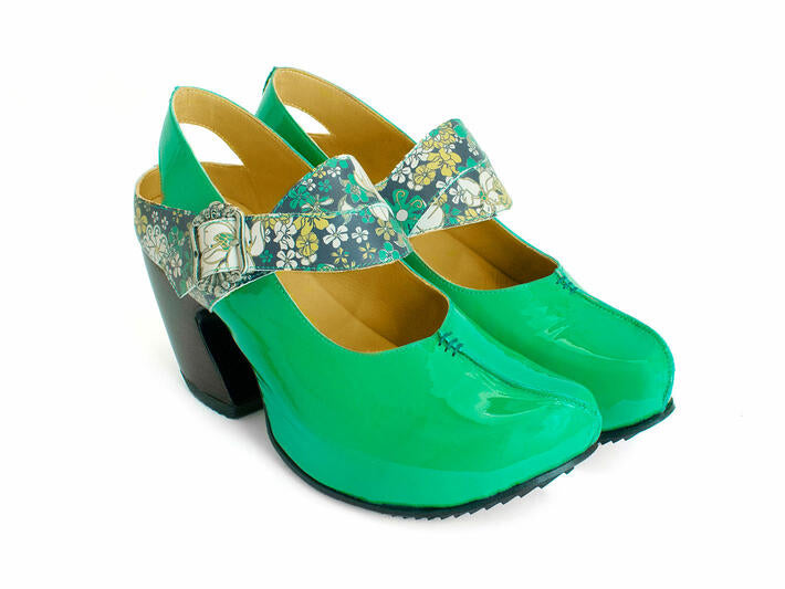 - Patent (yellow) and/or digitally printed (green floral only) leathers, or smooth and thick pebbled leathers (black only)