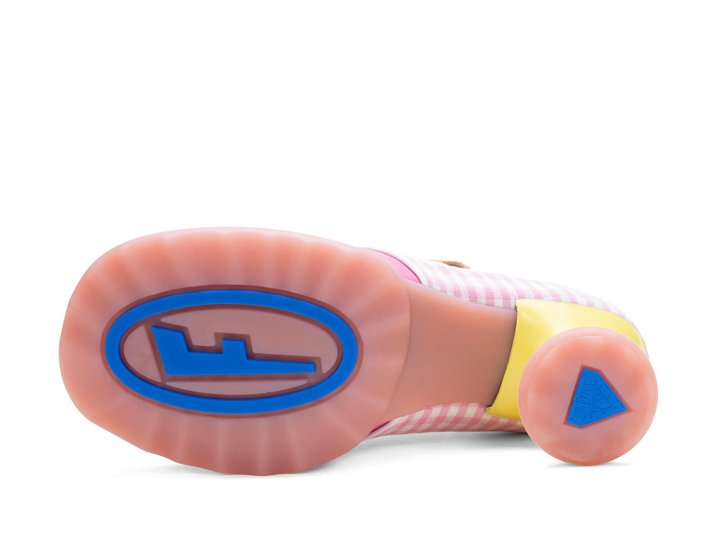 - Digitally printed embossed leather and gingham cotton textile (pink/yellow), smooth leather (pink/burgundy), nappa and suede (black, green), or patent (gold/orange)