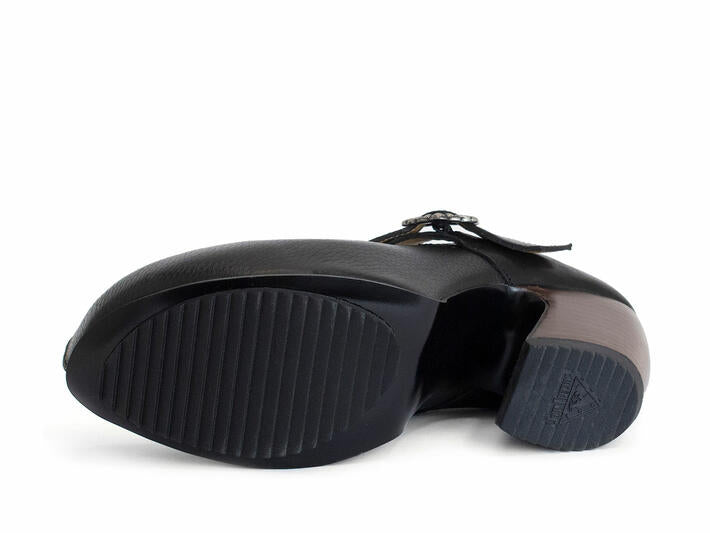 - Leather wrapped 3" heel with a 1.5" platform and a zig-zag rubber heel lift