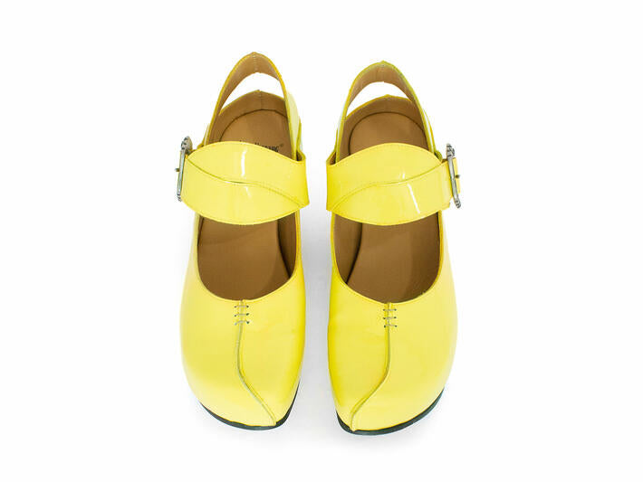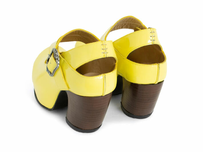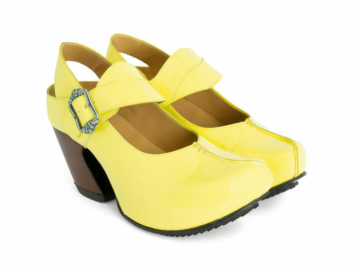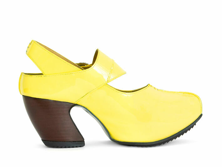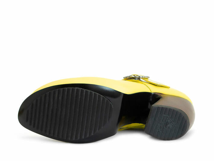 - Patent (yellow) and/or digitally printed (green floral only) leathers, or smooth and thick pebbled leathers (black only)