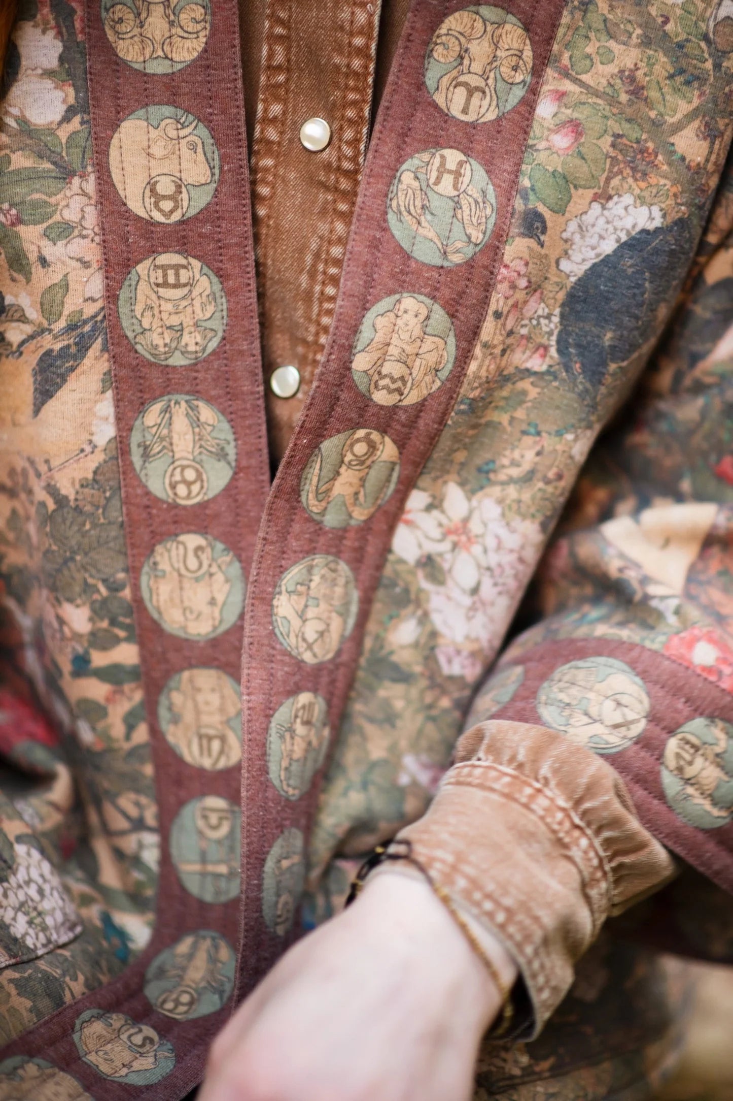 A regal, resplendent celebration of the stories told in the stars! Our Dreamweaver design features an iconic 1896 zodiac illustration by beloved Art Nouveau artist Alphonse Mucha, depicting a woman majestically surrounded by the by the 12 zodiac signs and adorned with intricate celestial jewellery. The background of this beautiful piece comes from a floral ink-on-silk scroll painting by Ueno Setsugaku, created in the 1860’s. To add even more detail to this design, we embellished the woman’s remarkable crown with a shining star, and trimmed everything with Mucha’s zodiac signs on a deep burgundy background. The result is an opulent and elegant take on Mucha’s work, with a nod to the luxe bohemianism of the 1970’s.