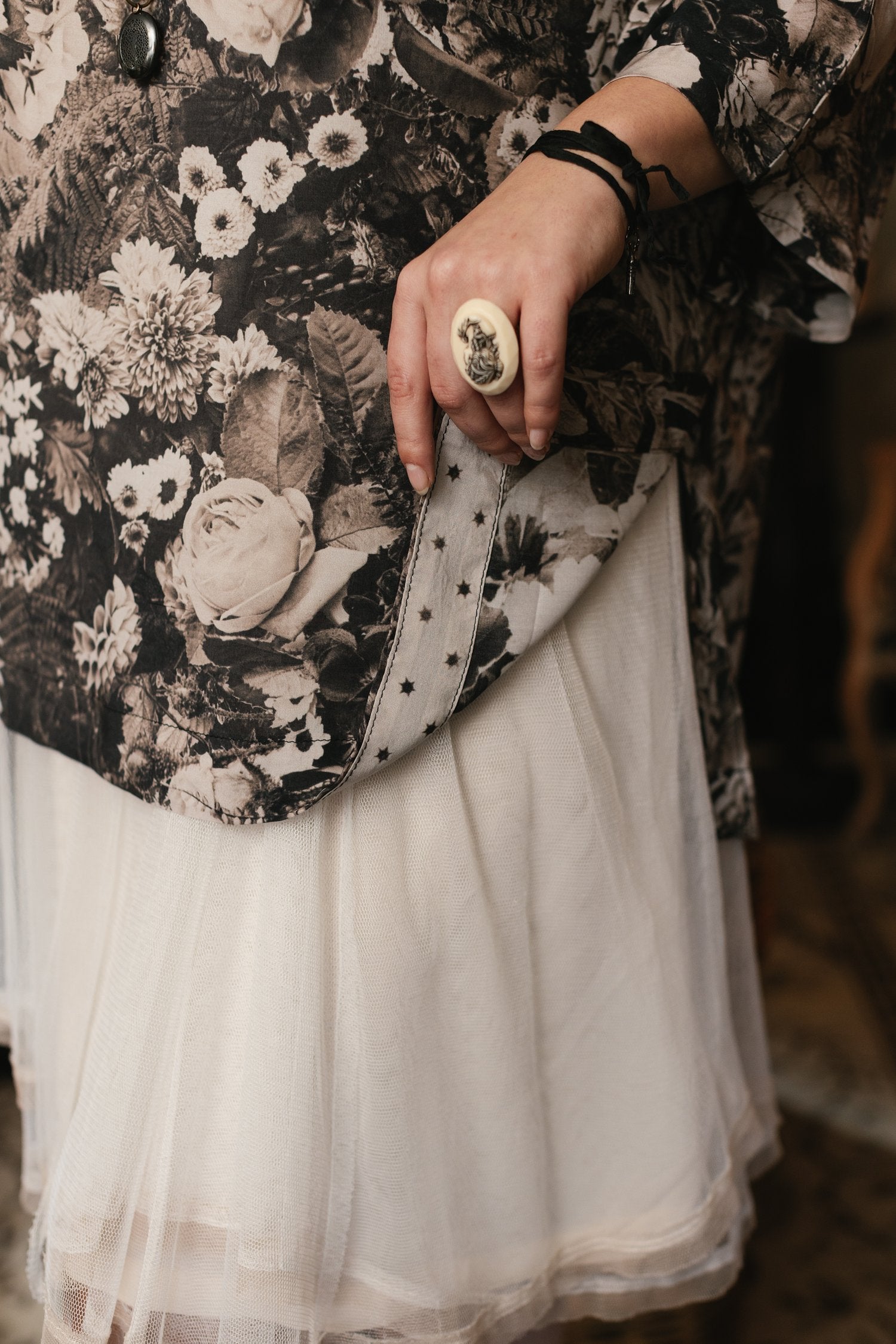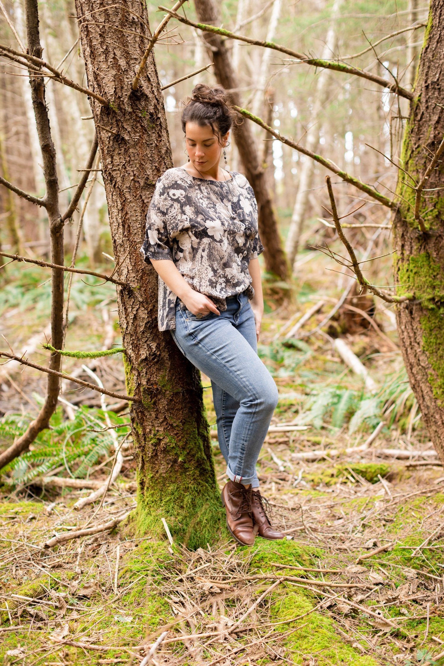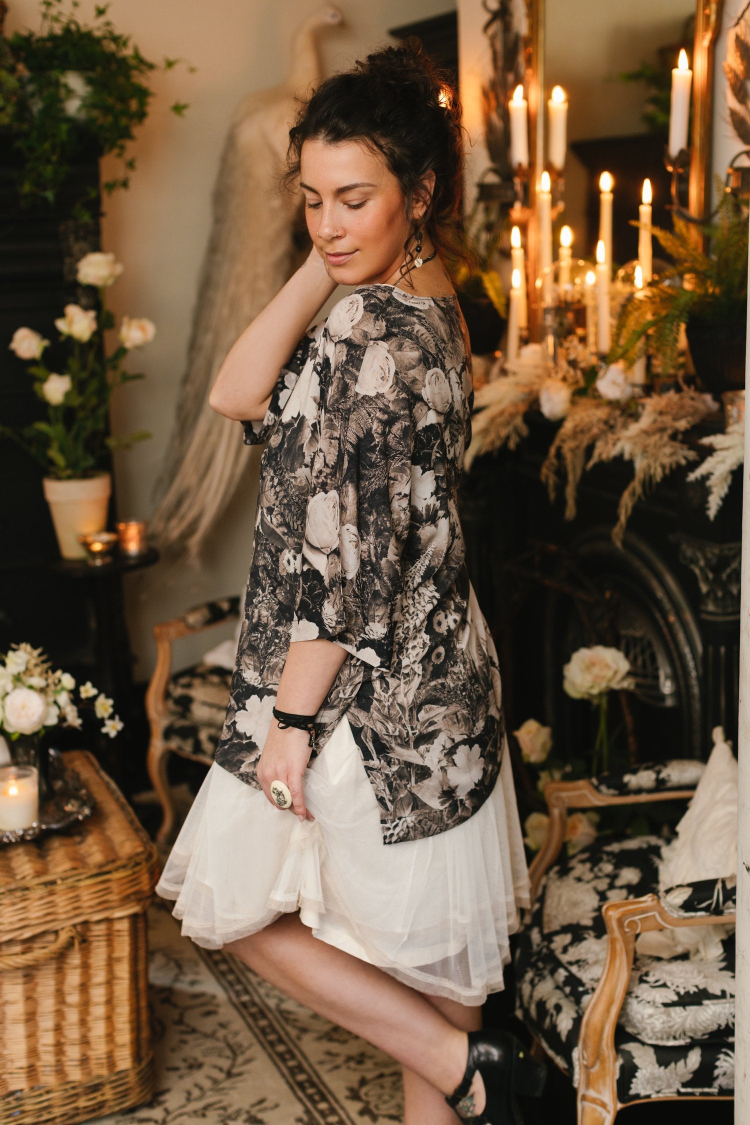 Measurements: S/M — length 64cm (shoulder to hem), width 57cm (underarm to underarm), L/XL — length 75cm, 63cm width (underarm to underarm) Model wears an S/M and is 5’3” for reference.