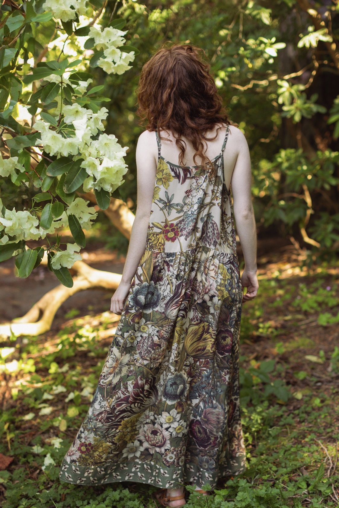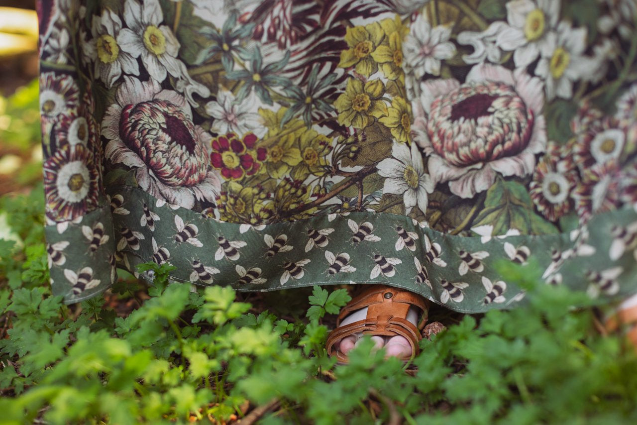 Sometimes — while oftentimes actually if we’re being honest — we design a piece for the purely selfish reason that we want to wear it ourselves ;) The Love Grows Wild dress was definitely one of these pieces! Our lush and verdant botanical print comes from the “12 Months of Flowers”, a series of remarkably beautiful hand-coloured etchings from the 1700s by engraver Henry Fletcher. The prints were commissioned by famed English gardener Robert Furber, and were published as a catalogue of flowers and seeds according to season. We chose the Fletcher’s print from the month of March for its delightfully detailed blooms, and then layered the flowers together to create a wild and wonderful print that captures the exuberance of the garden. The charming bumblebee trim comes from a museum seed catalogue from the late 1800’s. We are so excited to wear this print! It’s such a joyful and abundant design that goes with almost every colour. Sometimes more is more — more flowers, more love, more everything :)
