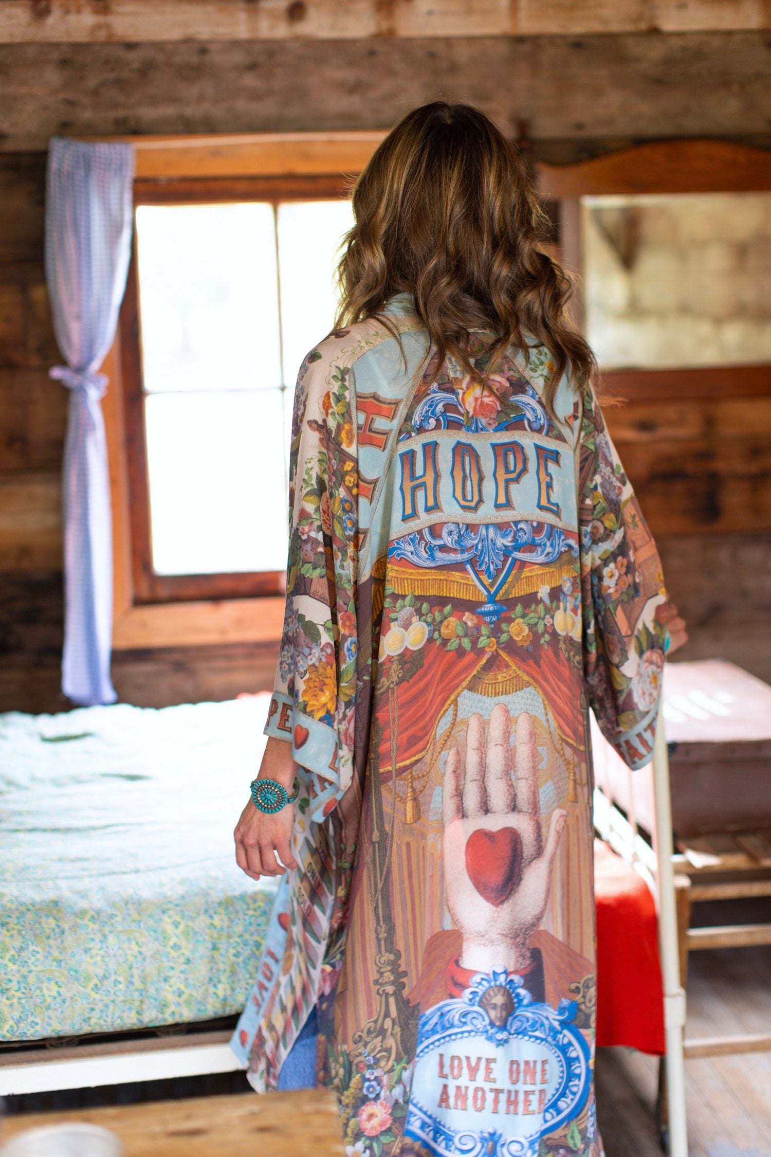 Joyful flowers, whimsical declarations of the heart, and unapologetic hope — this is our love language! The amazing artwork used for this piece was hand-drawn in Pennsylvania in 1854, and was originally created as a backdrop for a perfume and botanical extract display. We reworked the images and added our own touches — including the heart-in-hand (the symbol for kindness and charity), and messages in historic fonts (“Love is the only gold” and “Love one another”) to complement the original hand-lettering. The result is a true original: romantic, bohemian, and super cool.