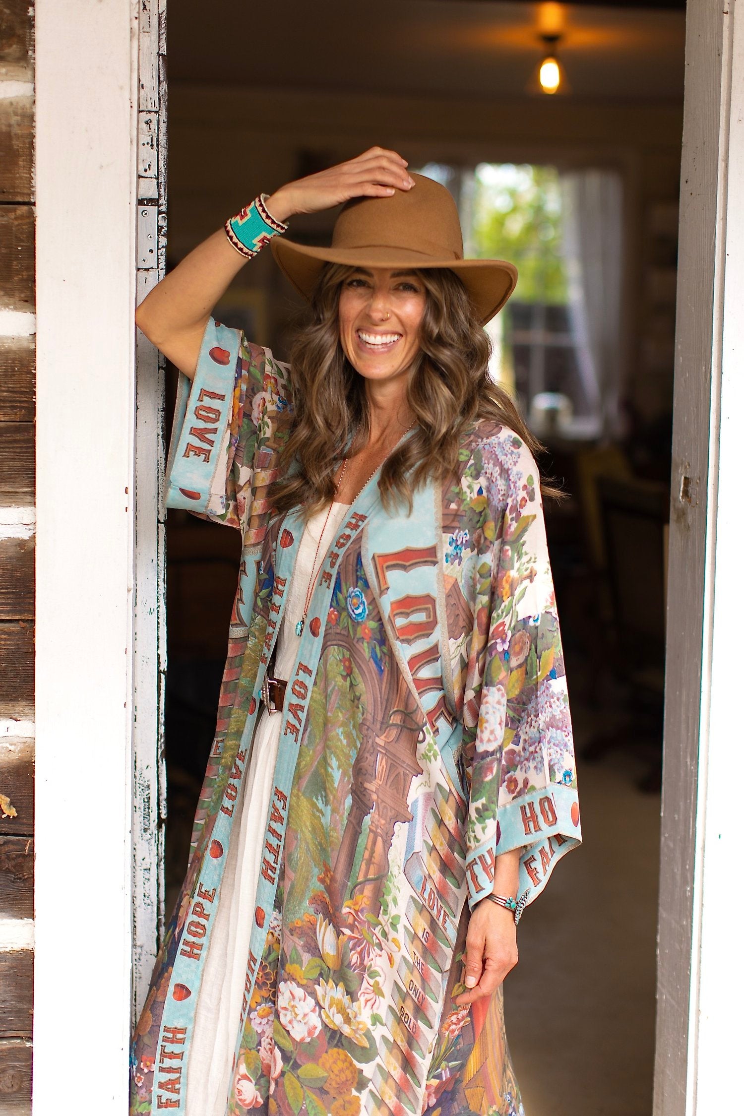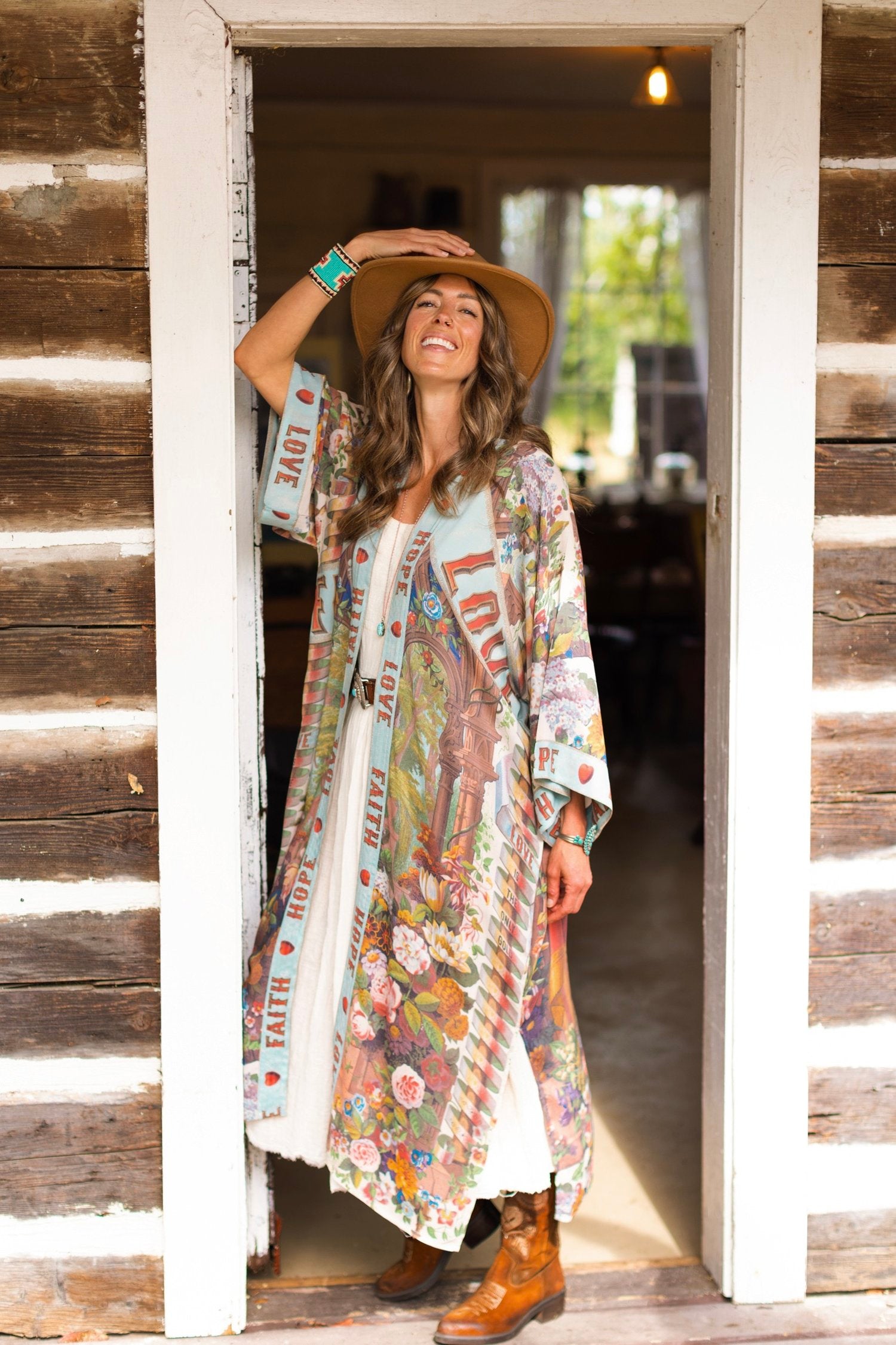 Kimono measurements: length 116cm, width 78 cm (across back, underarm to underarm). Model is 5’8” for reference.