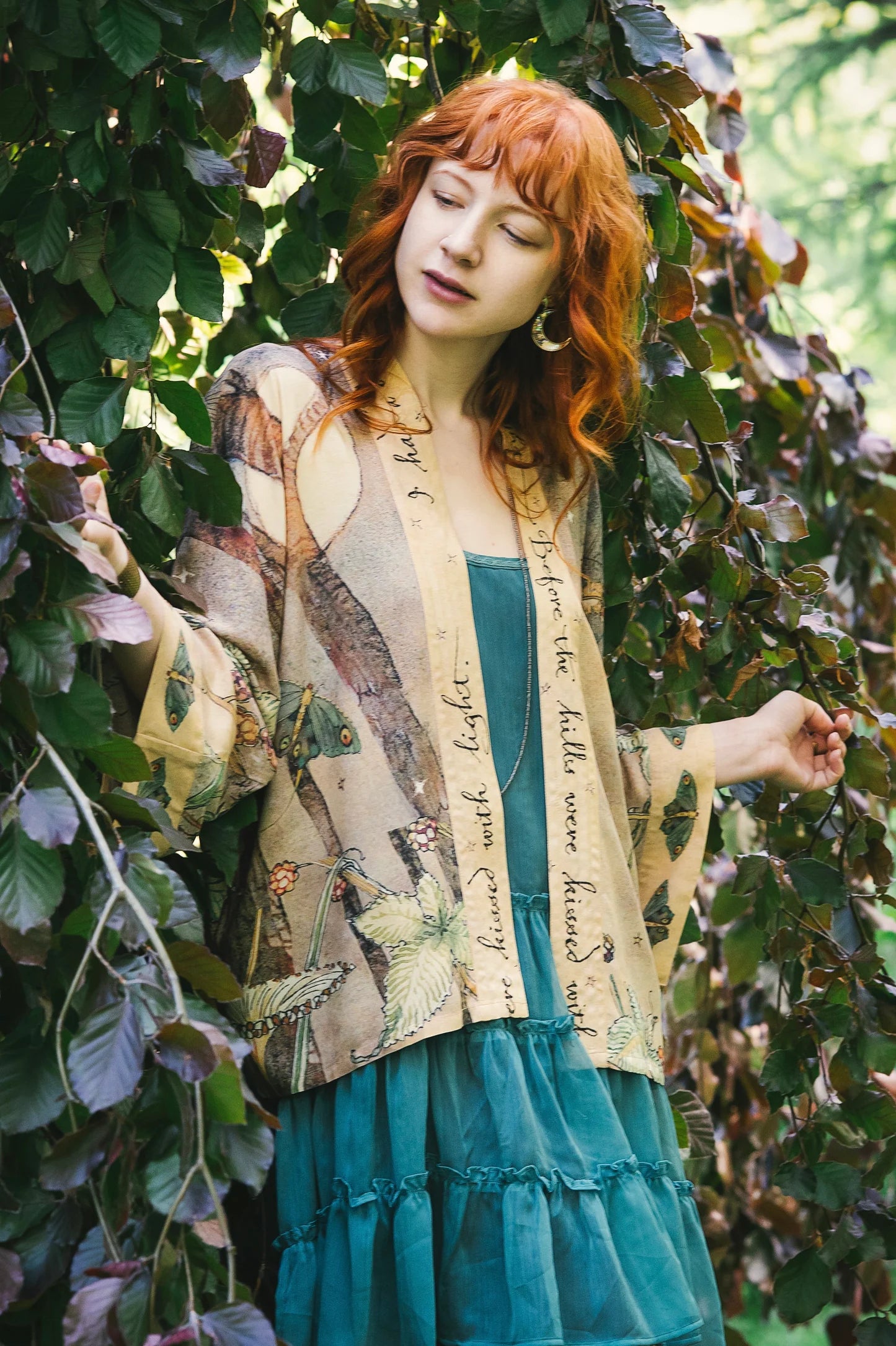 Lovelight was created using a collage of several pieces of Charles’ work, including a majestic guardian swallow carrying a lantern that cradles a glowing star and a delicate watercolour moth. The whole collection is edged with a piece of poetry by van Sandwyck, which wraps the wearer in words as soft as the dawn: I had a dream in dark of night, before the hills were kissed with light.