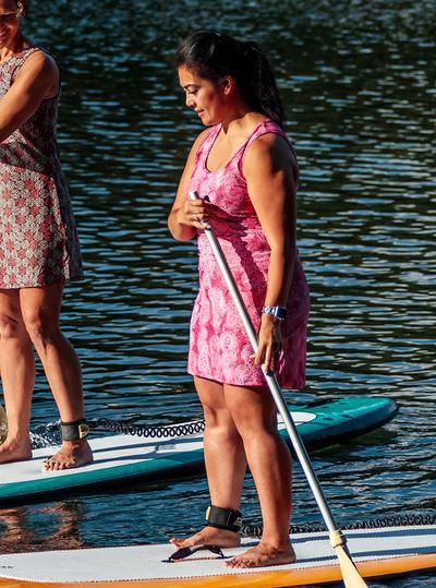 - Scooped neckline exercise dress with back pocket that never gets in the way.
