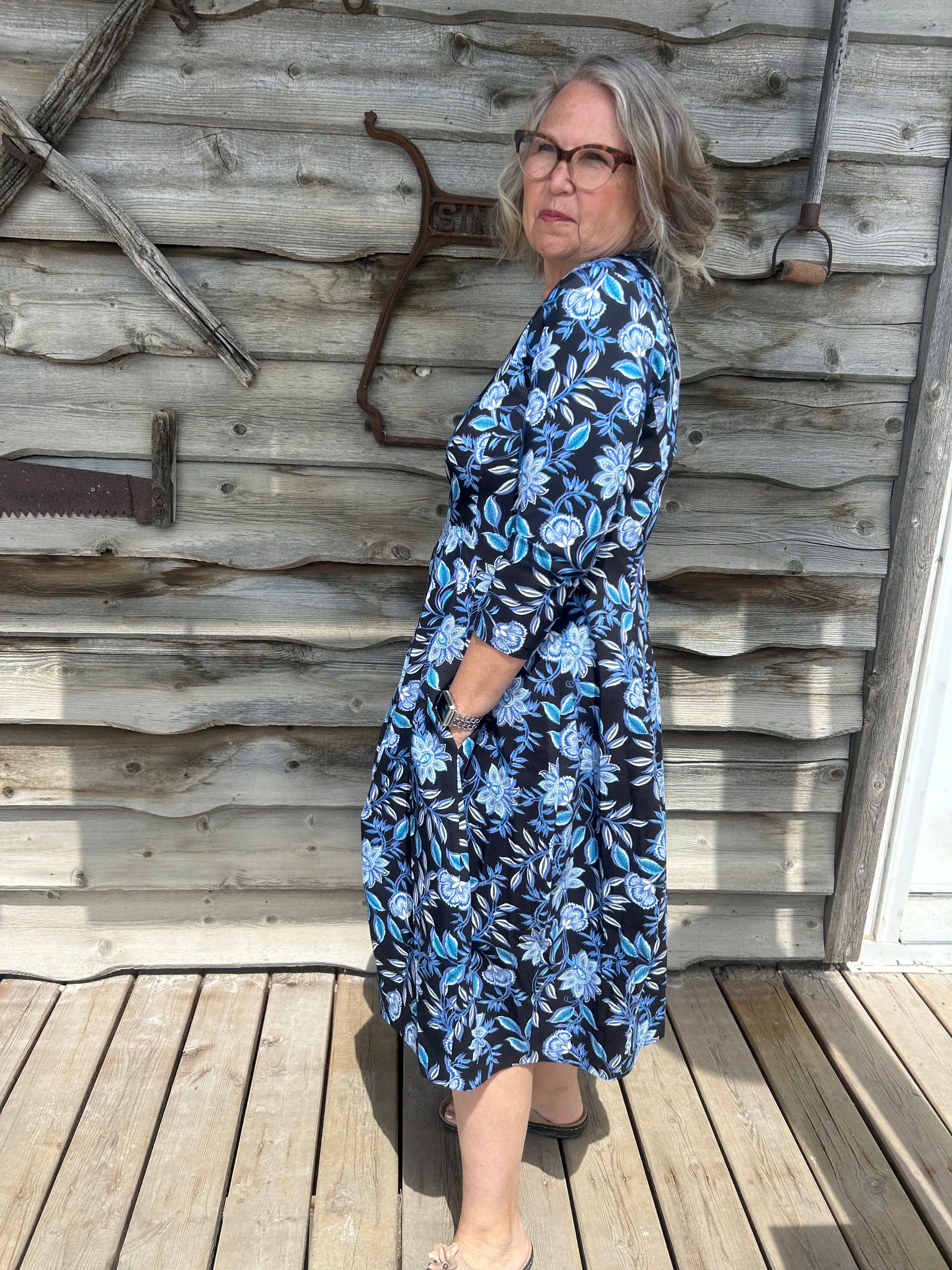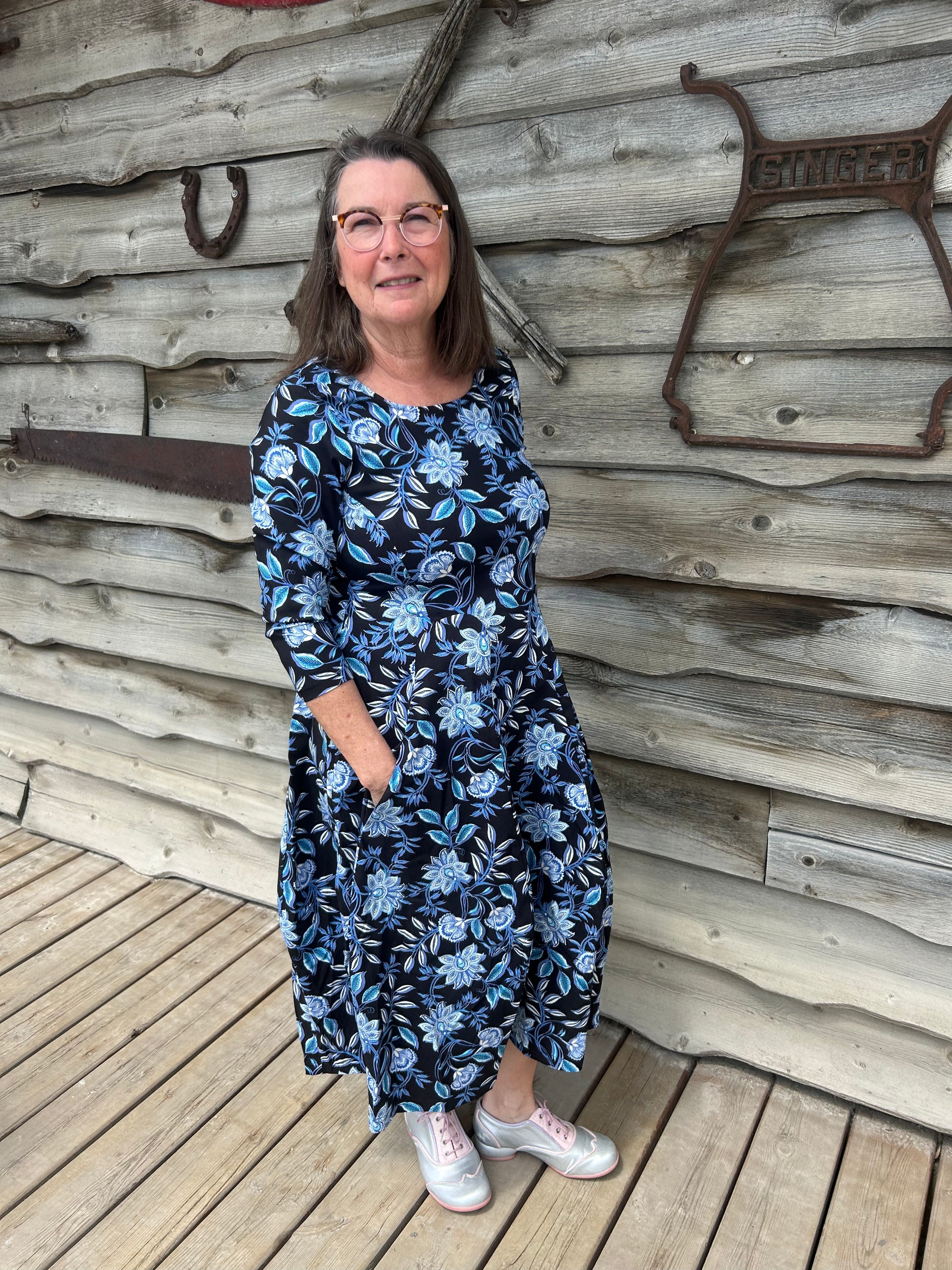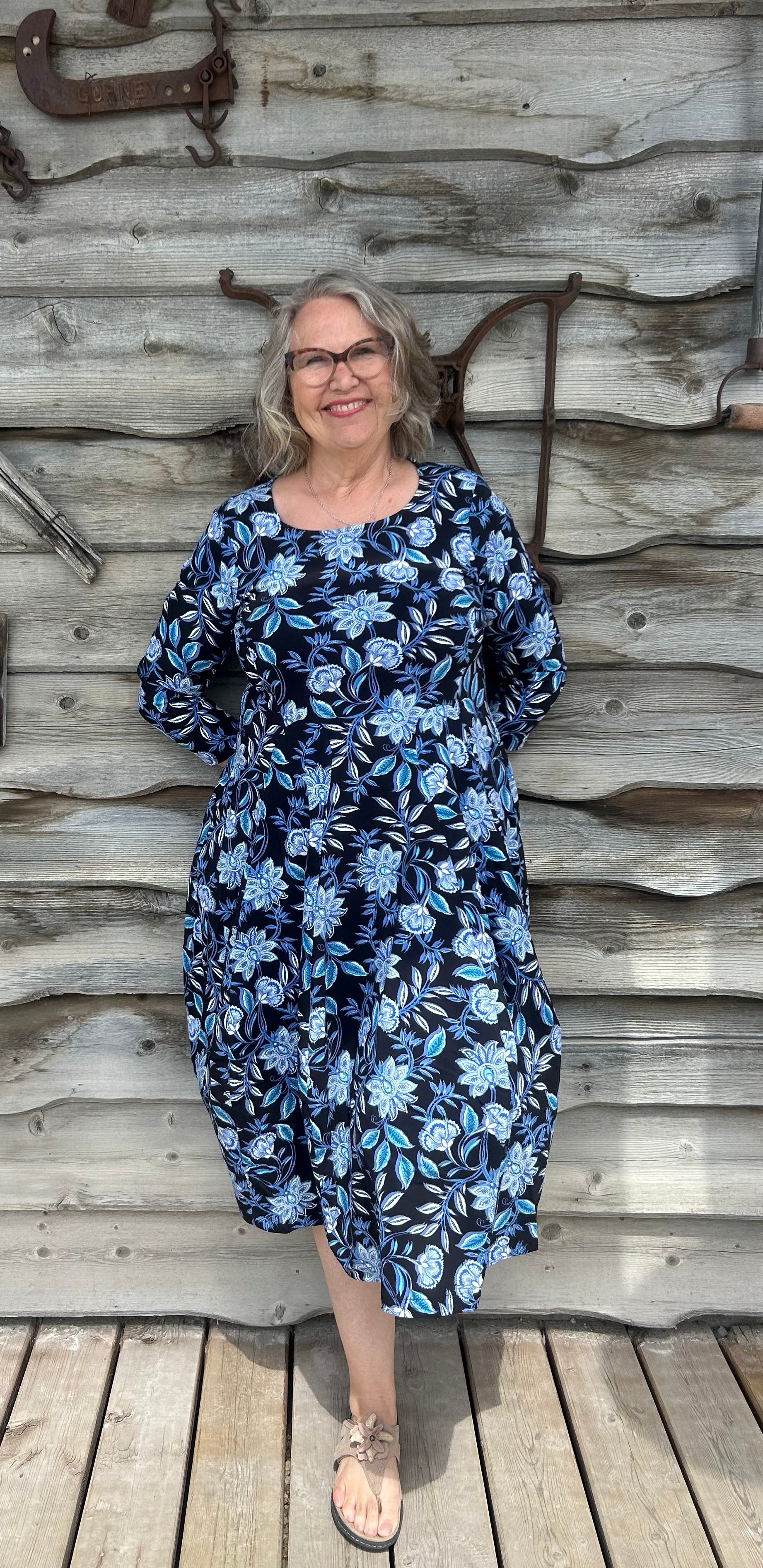 Valia Castella Dress Black with Blue Floral Custom Made Exclusively For Eveline Street